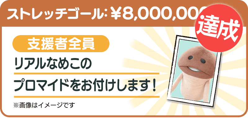 【達成しました!】ご支援いただいた方全員に、浅草の老舗プロマイドスタジオで撮影したガチの「プロマイド」をお付けします。従来のリアルなめこさんでは体が大きすぎて撮影スタジオに入ることができなかったのですが、身軽になったリアルなめこさんなら入れそうということで念願のプロマイド撮影を行おうと考えています。ストレッチゴール達成となり実際に撮影を行われる場合は、その模様を動画で公開します。
