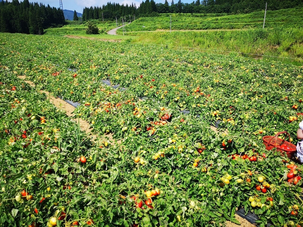 冬から春にかけてしみこんだ雪解け水を含んだ土から育つトマトは、8月になると真っ赤に実が完熟して収穫の頃を迎えます。収穫は、ボランティアや村民の方など総勢200人もの人を動員して、トマトが完熟しているか、痛んでいないかを確認しながら一つひとつ手摘みをしています。