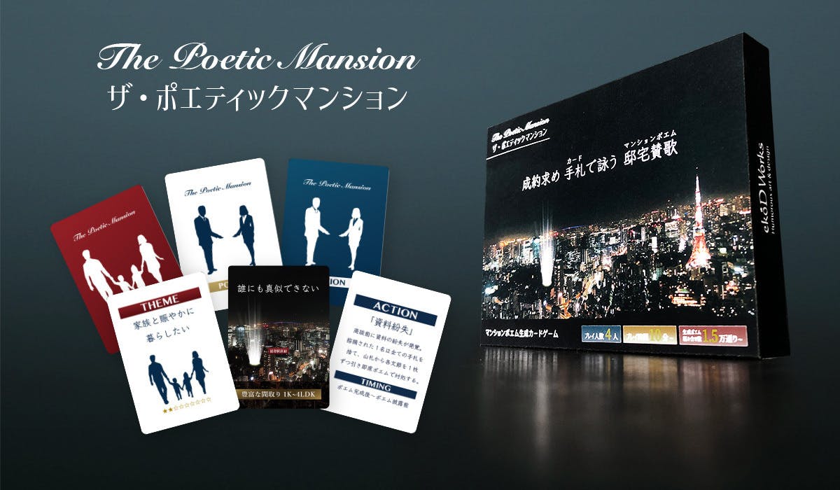 「ザ・ポエティックマンション」は、カードを組み合わせてポエムを生成し、(架空の)マンションをより魅力的に訴求して成約を勝ち取るカードゲームです。
