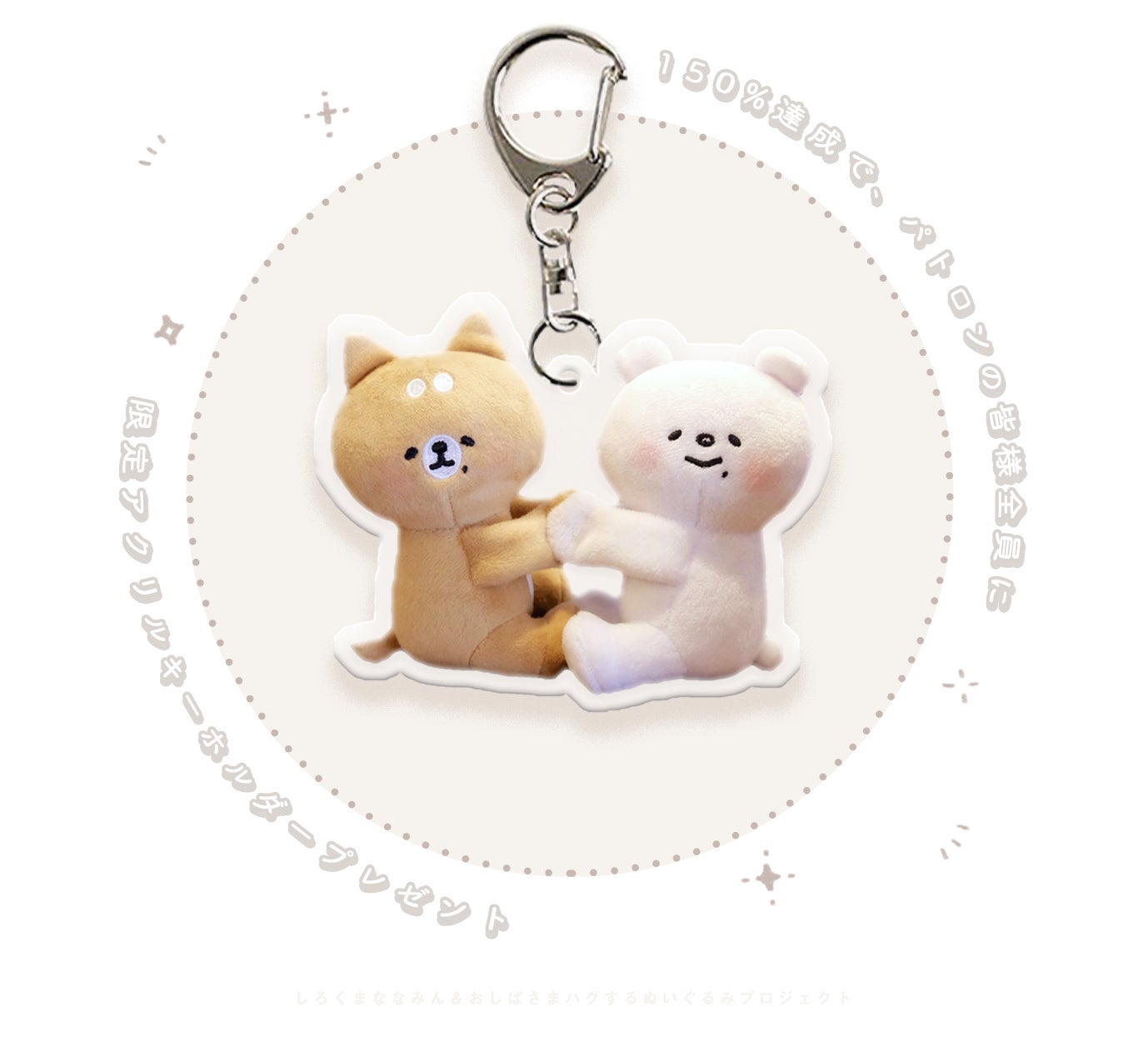 達成度が150%を達成すると【 ご支援いただいた皆さま全員に 】ハグぬいアクリルキーホルダーをプレゼント!このプロジェクト限定デザイン、必見です。