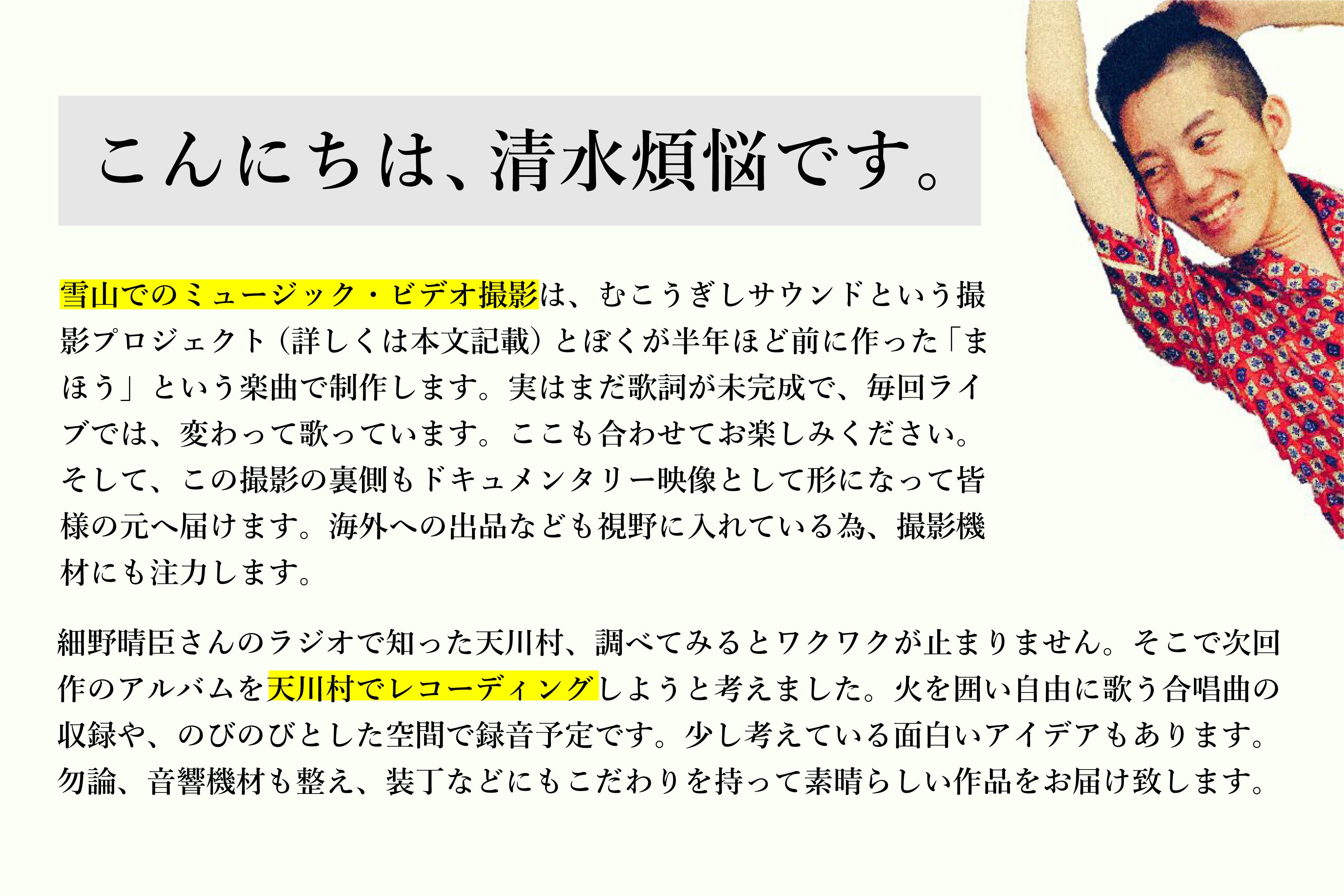 つらつらと文字を重ねてしまいましたが、つまり私が言いたいのは、このクラウドファンディングは、きっとまた、煩悩君からみなさんに送られた”作戦会議”へのお誘いなのだろう、というです。正直、いきなりで戸惑うことでしょう。「雪山でMVを撮りたい、天国のような村で収録をしたい」そんな突拍子のない話をされて、困らない人間はそういません。私も戸惑いました。けれど、そんな突拍子のない話に、ワクワクしない人間もそういません。私も興奮しました。煩悩君は、またそれを知ってか知らずか、きっとこのお誘いを大々的に行っています。