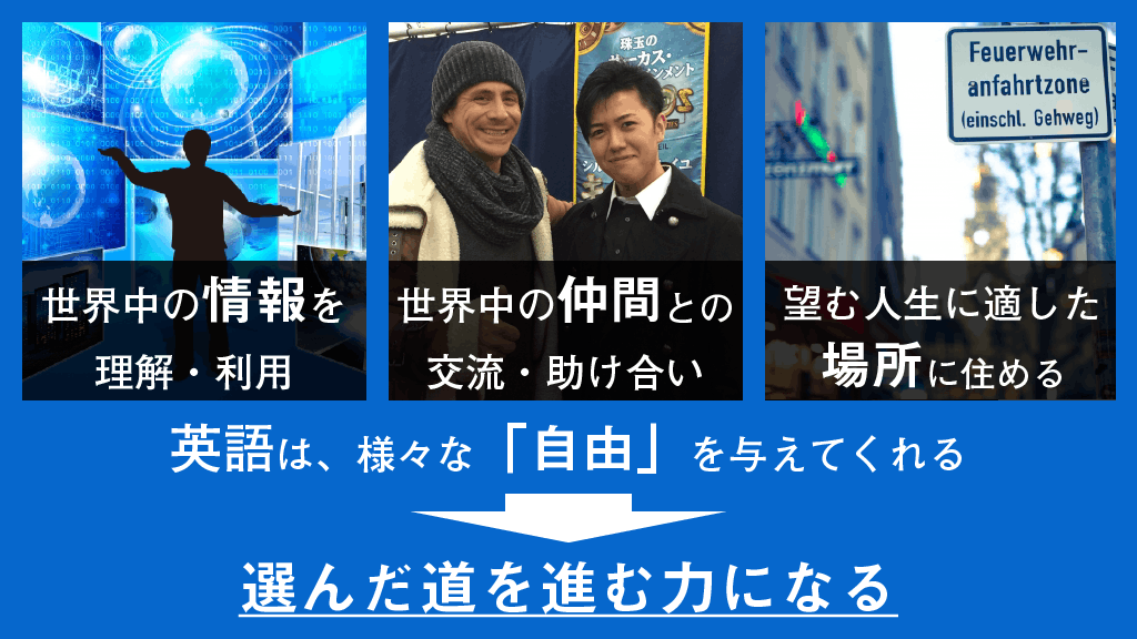 また英語は、私たちに様々な自由を与えてくれます。「より多くの情報を理解・利用できる自由」「世界中の仲間と交流する自由」そして「好きな場所に住む自由」など。