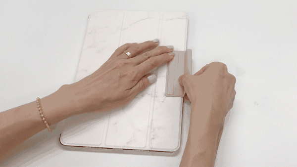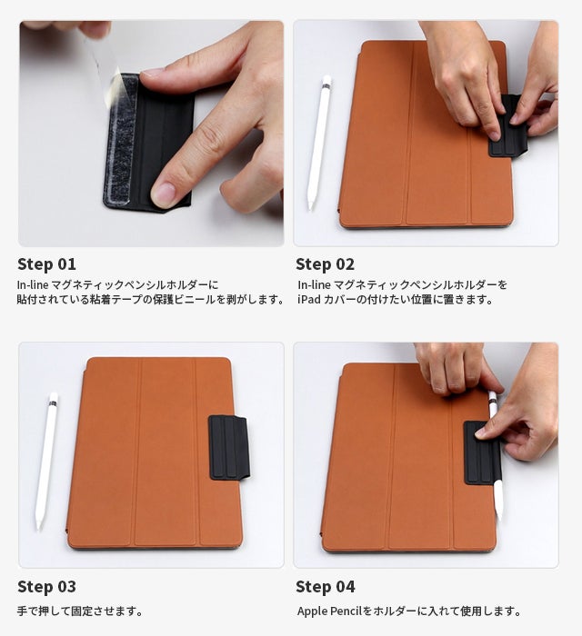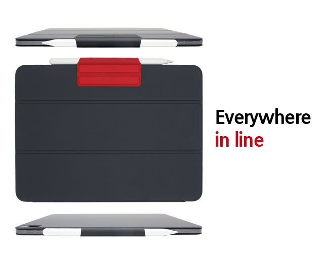 In-lineは、iPadケースに簡単に取り付けて使えます。ケースと一直線となり、水平な位置にApple Pencilを収納できるため、かさばりません。どんな使用シーンでも邪魔にならないようにIn-lineに内蔵されているマグネットを利用して簡単に折りたたむことができます。Apple純正カバーと一体感のあるデザインも魅力のひとつです。
