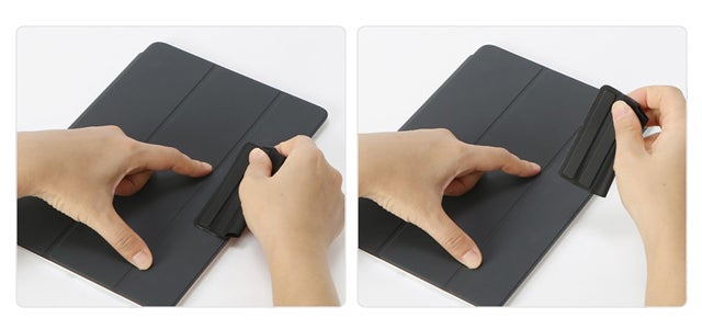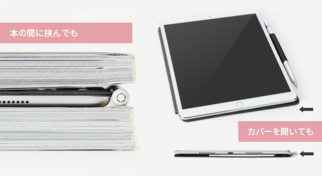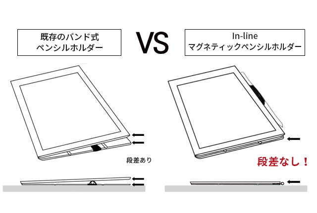 既存のバンド式Pencilホルダーの場合、背面にペンシルホルダによる段差ができてしまいますが、In-lineマグネッティックペンシルホルダーは、どんな状況でも段差がなく、iPad カバーと水平な位置になりますので、便利に使えます。