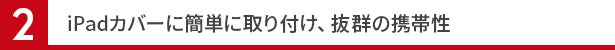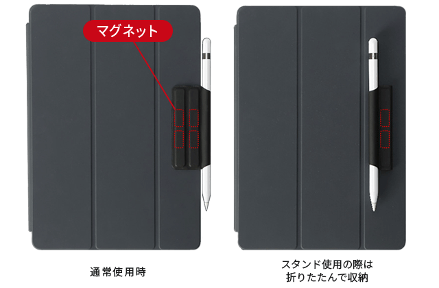 iPad カバーをスタンドにして使う時にはペンシルホルダーを簡単に折りたためる仕組みなので、邪魔にならず、すっきりと収納できます。