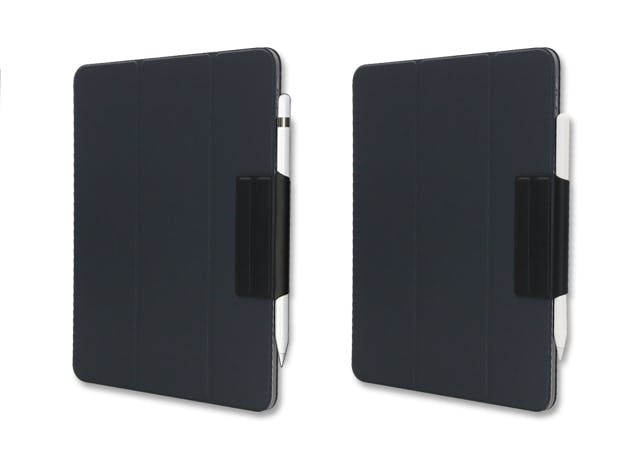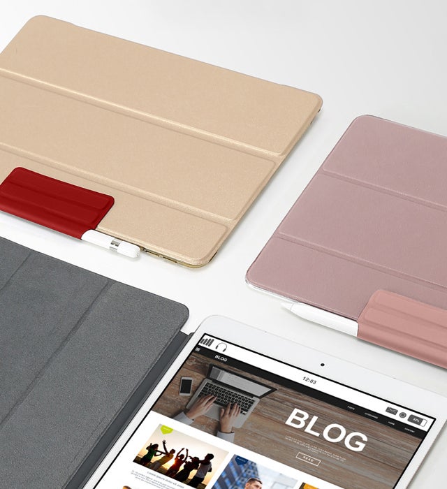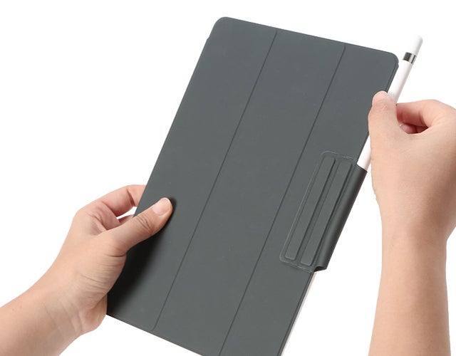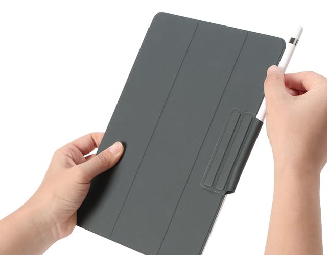 ケースを机に置く時も、スタンドにしてもApple Pencilが邪魔になることのないよう設計されています。すべてのサイズのiPadやiPad Miniでも使用可能です。