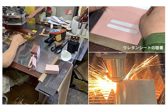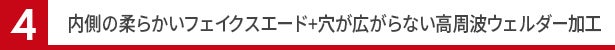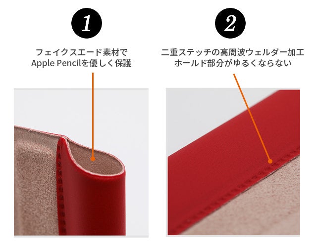内側には柔らかいフェイクスエードを使用、Apple Pencilを傷つけないように優しく保護します。また、内部に透明のウレタンシートを吸着してから高周波ウェルダーで表面と裏面を一回ずつ、二重にステッチ加工を施しています。