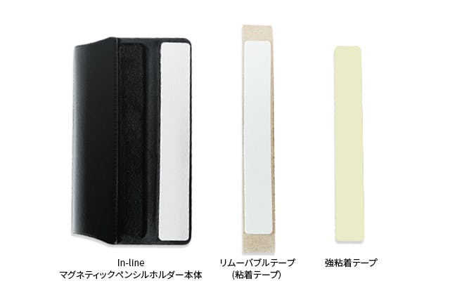In-lineマグネッティックペンシルホルダー本体、リムーバブルテープ(粘着テープ)1枚、強粘着両面テープ1枚