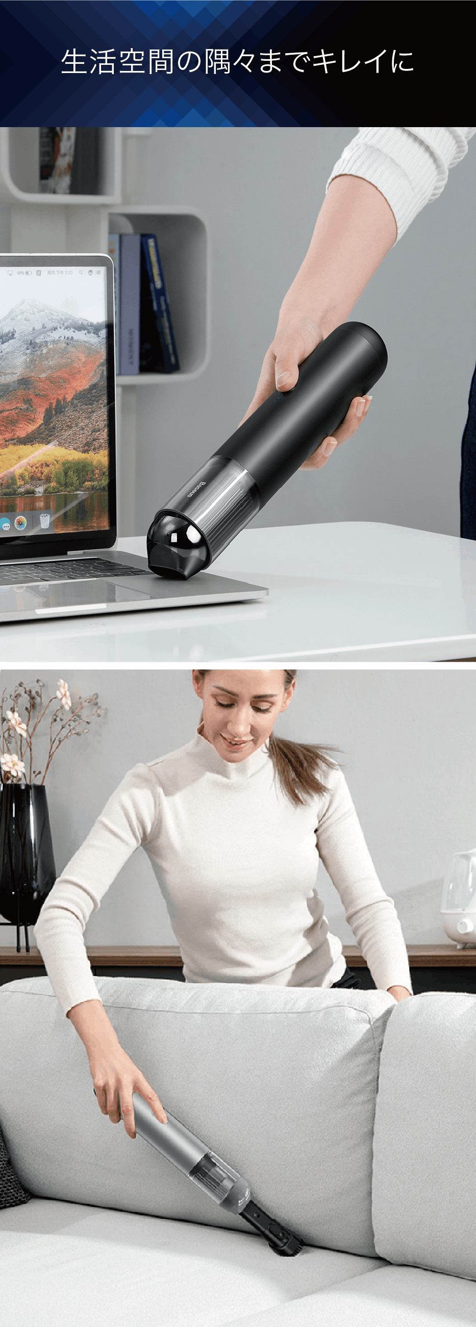USB充電対応でコードレス&コンパクト。45分間連続使用できるので、いつでもどこでも手軽にお掃除できます。0.3ミクロンの粒子粒子の99.97%以上をキャッチするHEPAナノフィルターで強力吸塵。お部屋や車内のインテリアにも調和する高級感あるデザインです。