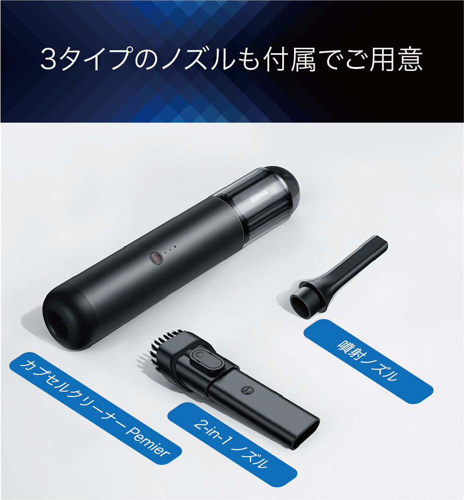 用途に合わせて3タイプのノズルを装着することで、フローリングのカドや狭い隙間などのゴミやホコリも除去できます。直に細部のゴミやホコリを吸い込みたい時はブラシなし、絨毯や車の吹出し口など柔らかくて凸凹のある場所にはブラシ付きに交換できる「2-in-1ノズル」。さらに細かい隙間のホコリを取るには「噴射ノズル」と、3種のノズル取り換えがワンタッチできますので、小さな隙間のホコリも残さずにお掃除できます。