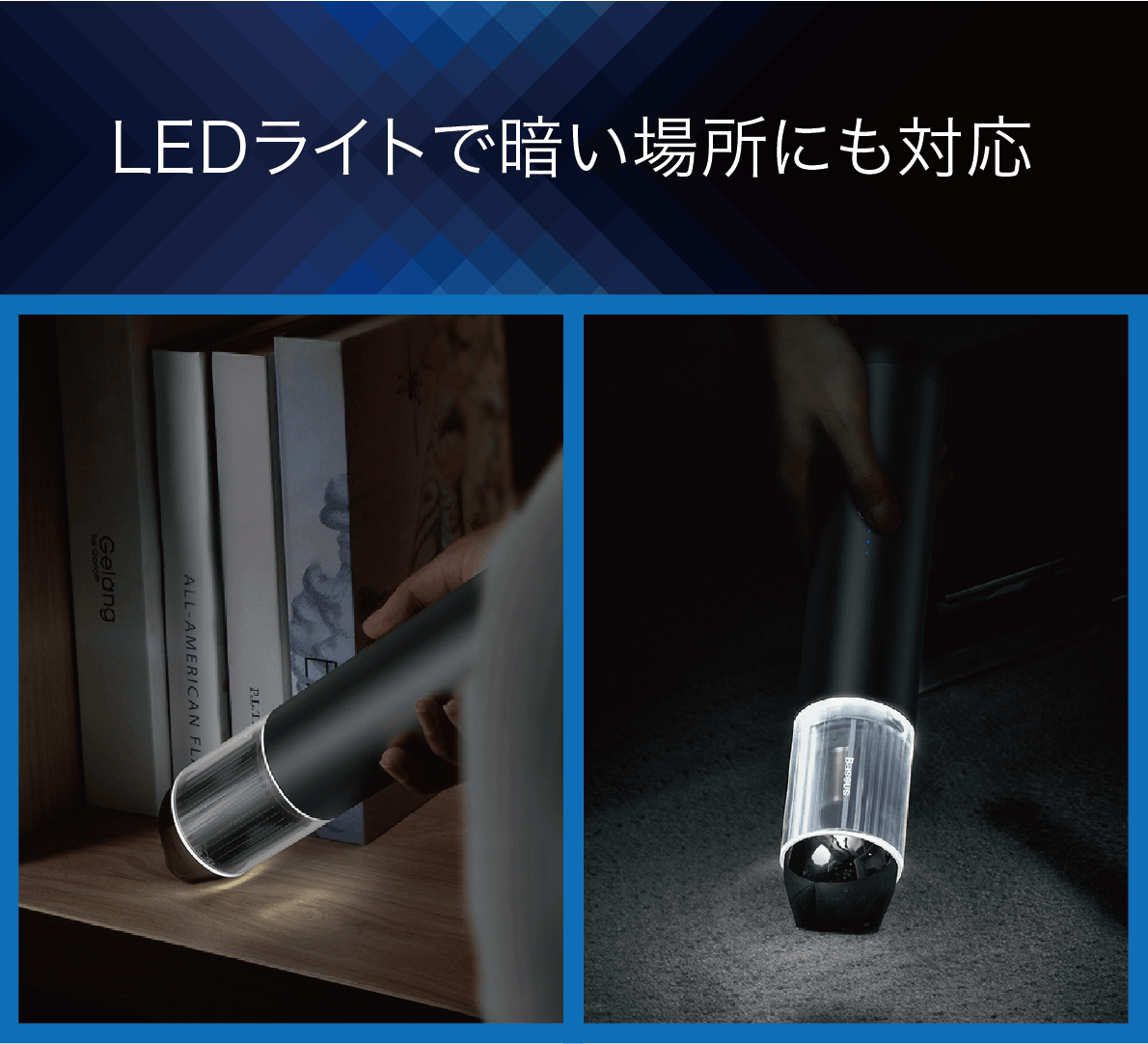 パワーボタンを3秒間長押しすると「ライティングモード」に切り替わり、LEDライトが点灯します。暗い箇所も照らせるので、車の隅など普段掃除しづらい場所のゴミやホコリもしっかり吸引できます。