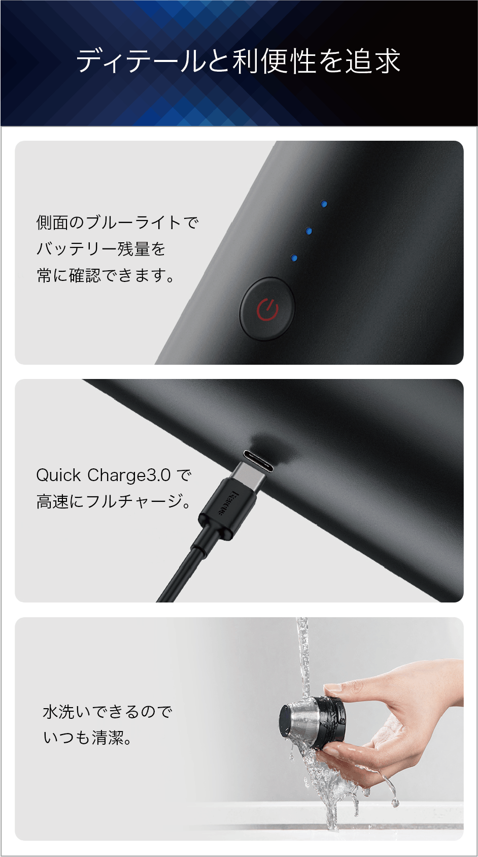 【カプセルクリーナーPremier】はデザインのディティールにもこだわるとともに、バッテリー残量がひと目でわかるブルーライトや、クイックチャージ3.0での急速USB充電、水洗いできるフィルターなど、利便性にもさらなる配慮を重ねています。