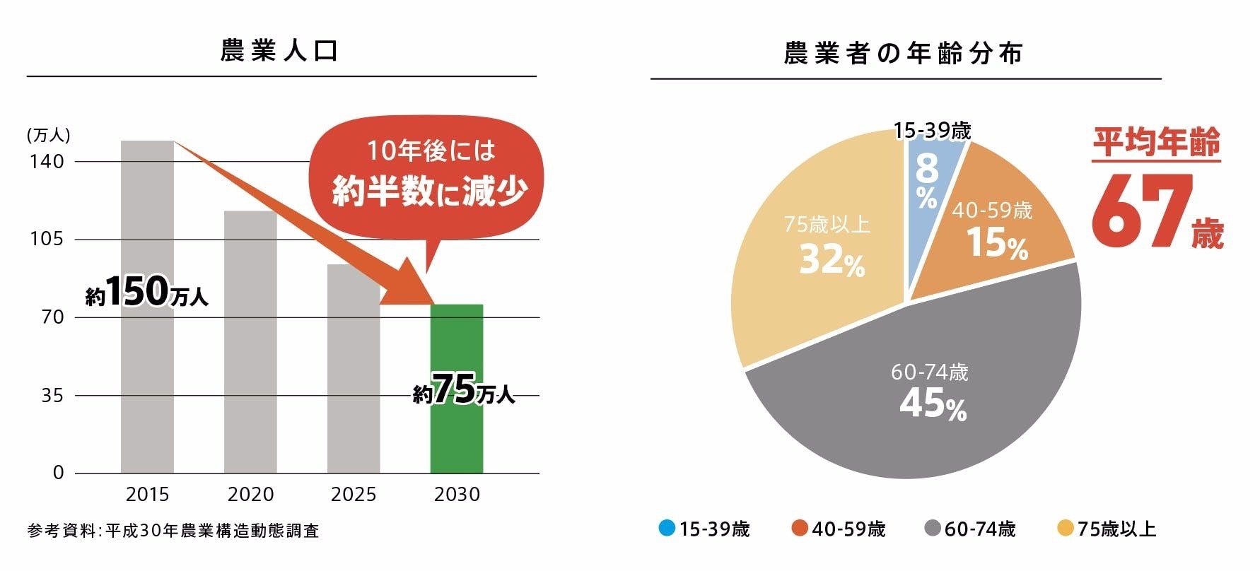 主な仕事に農業を選んでいる人(基幹的農業従事者)の数は、8年前の平成22年で205.1万人なのに対し、平成30年は145.1万人に激減。平均年齢も67歳と高齢化が進んでいます。
