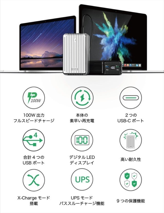 ポータブル充電器市場の多くの製品は、低USB-C電力出力(18/30/45 / 60W)と電力不足であり、15インチ MacBook Pro(87W)などの高USB-C出力を必要とするデバイスを充電する場合、予想よりも長い時間がかかってしまいます。 SuperTankは入力と出力の両方として機能できる単一ポートに最大100WのUSB-C電力供給を実現しています。 15インチMacBook Pro 2018を0%から100%(未使用時)に1.5時間ほどで充電ができます。(※自社調べ)