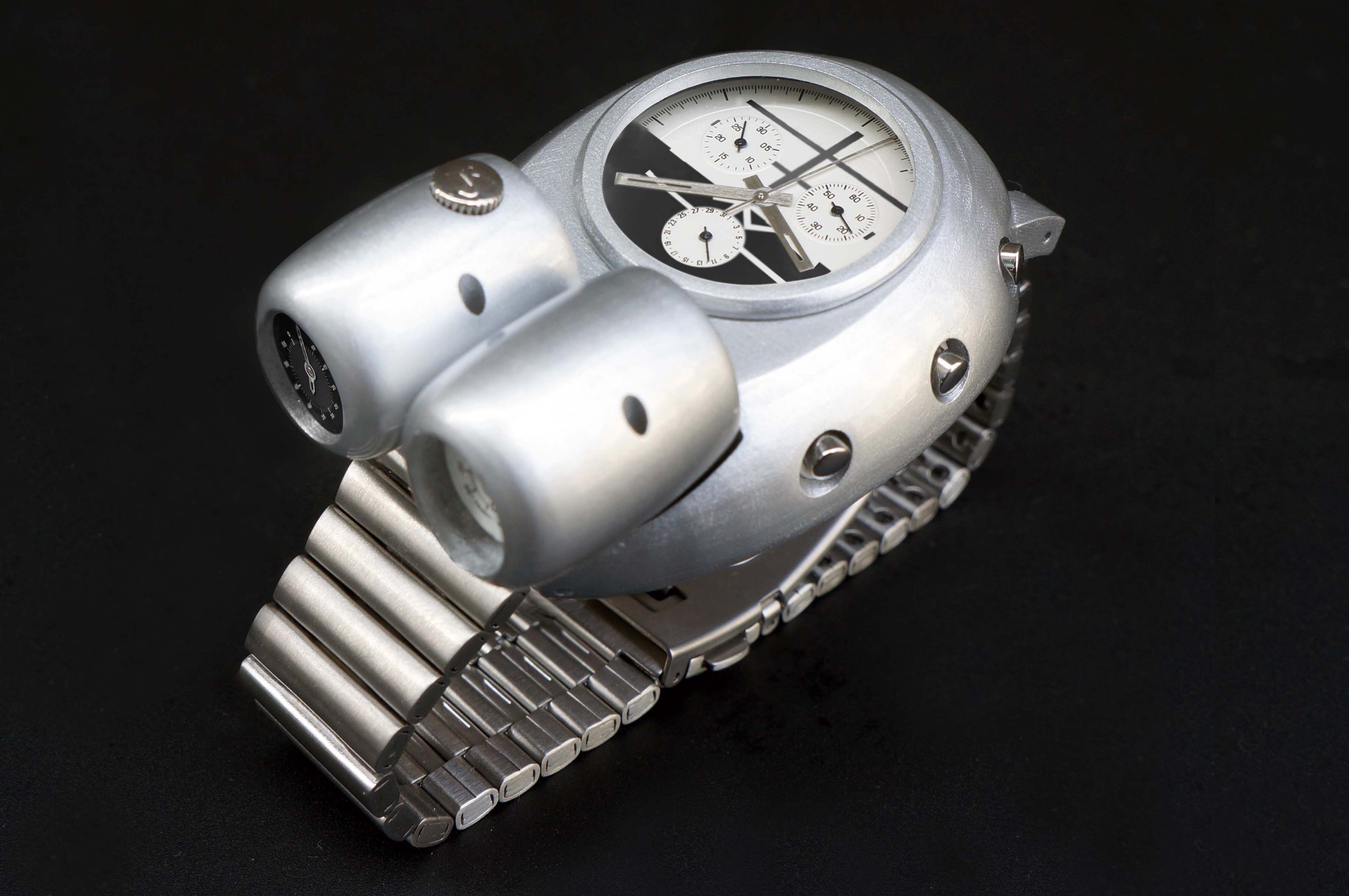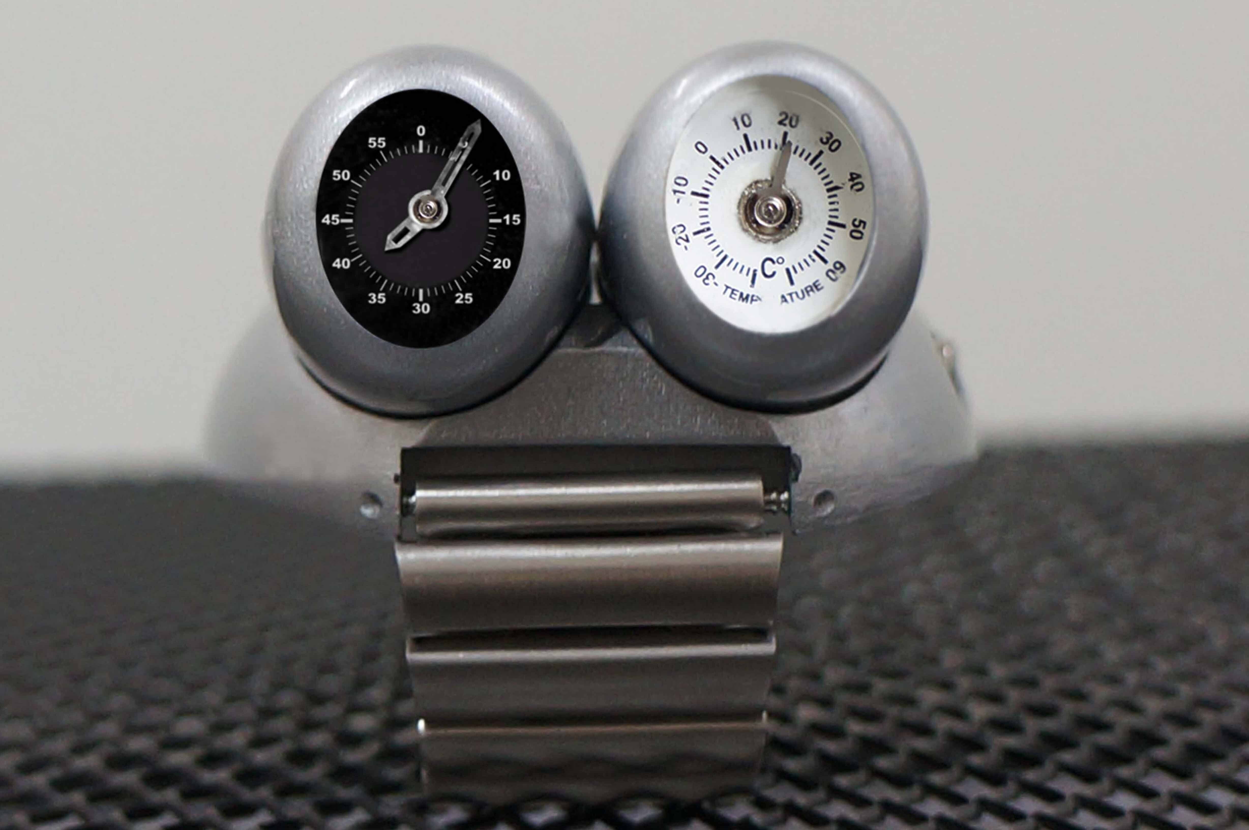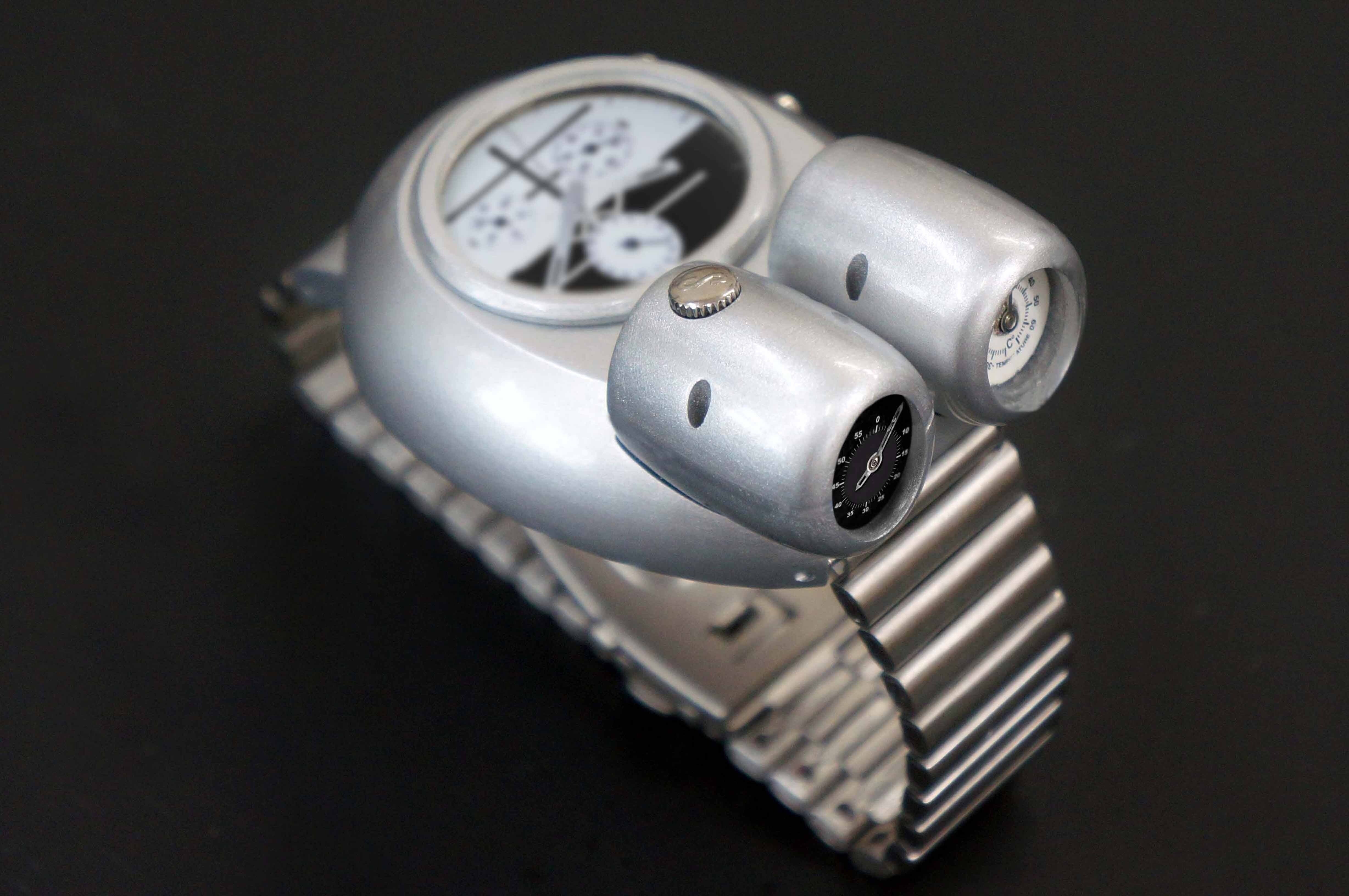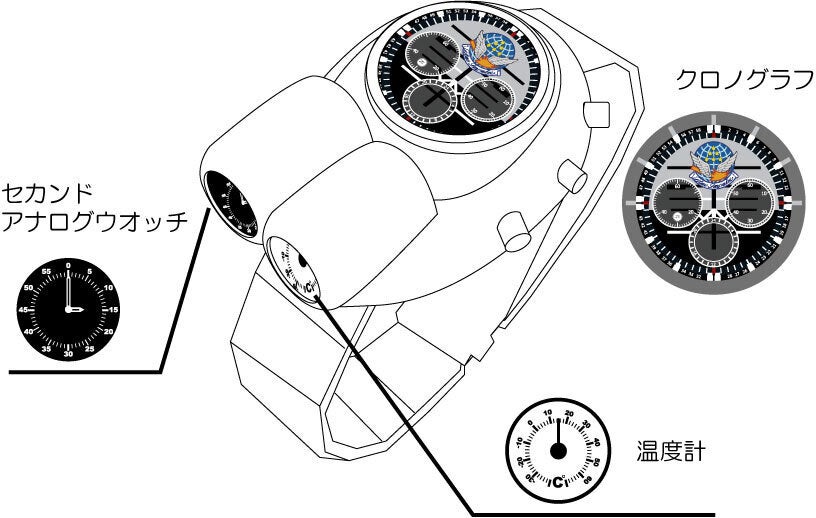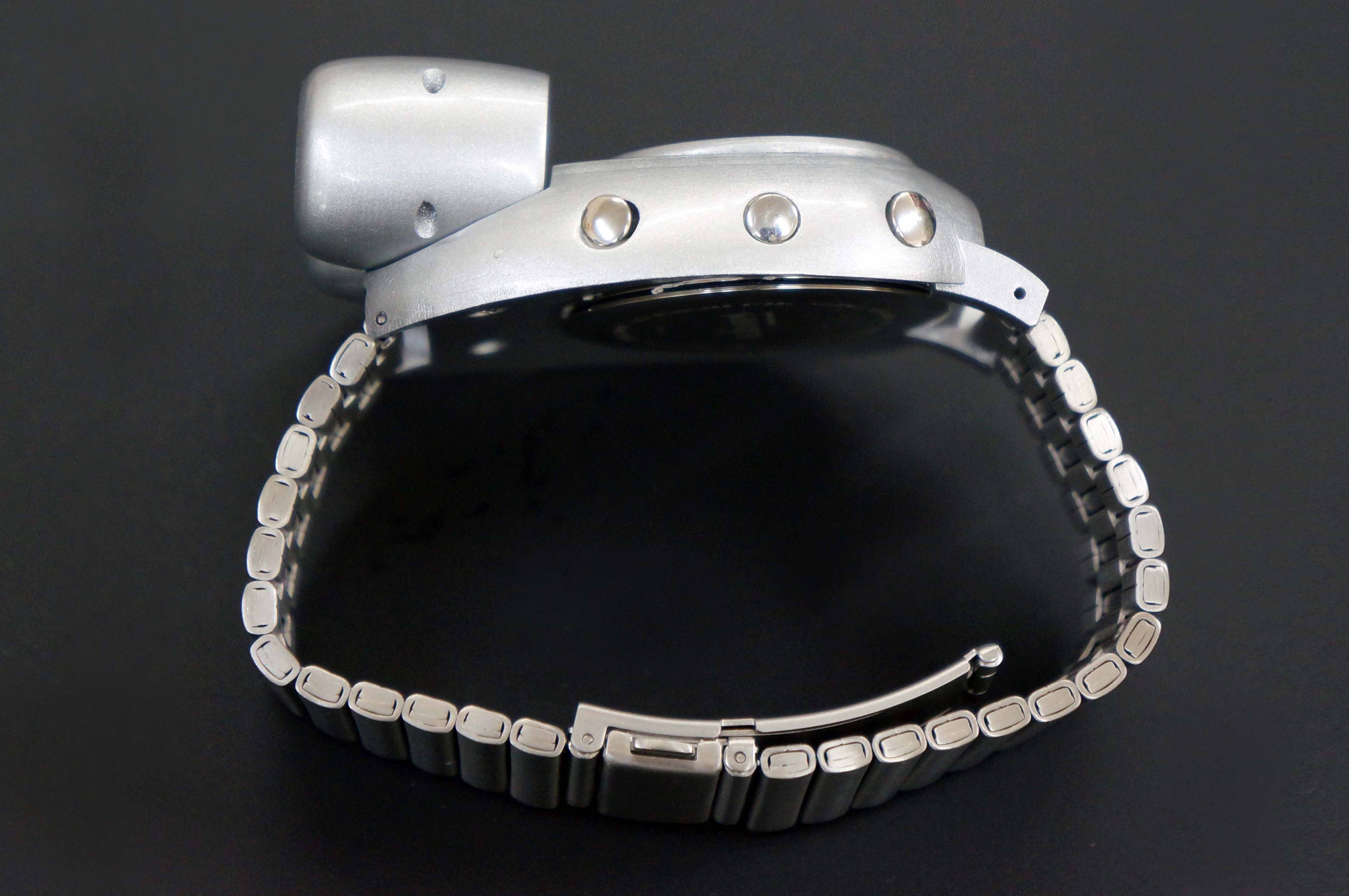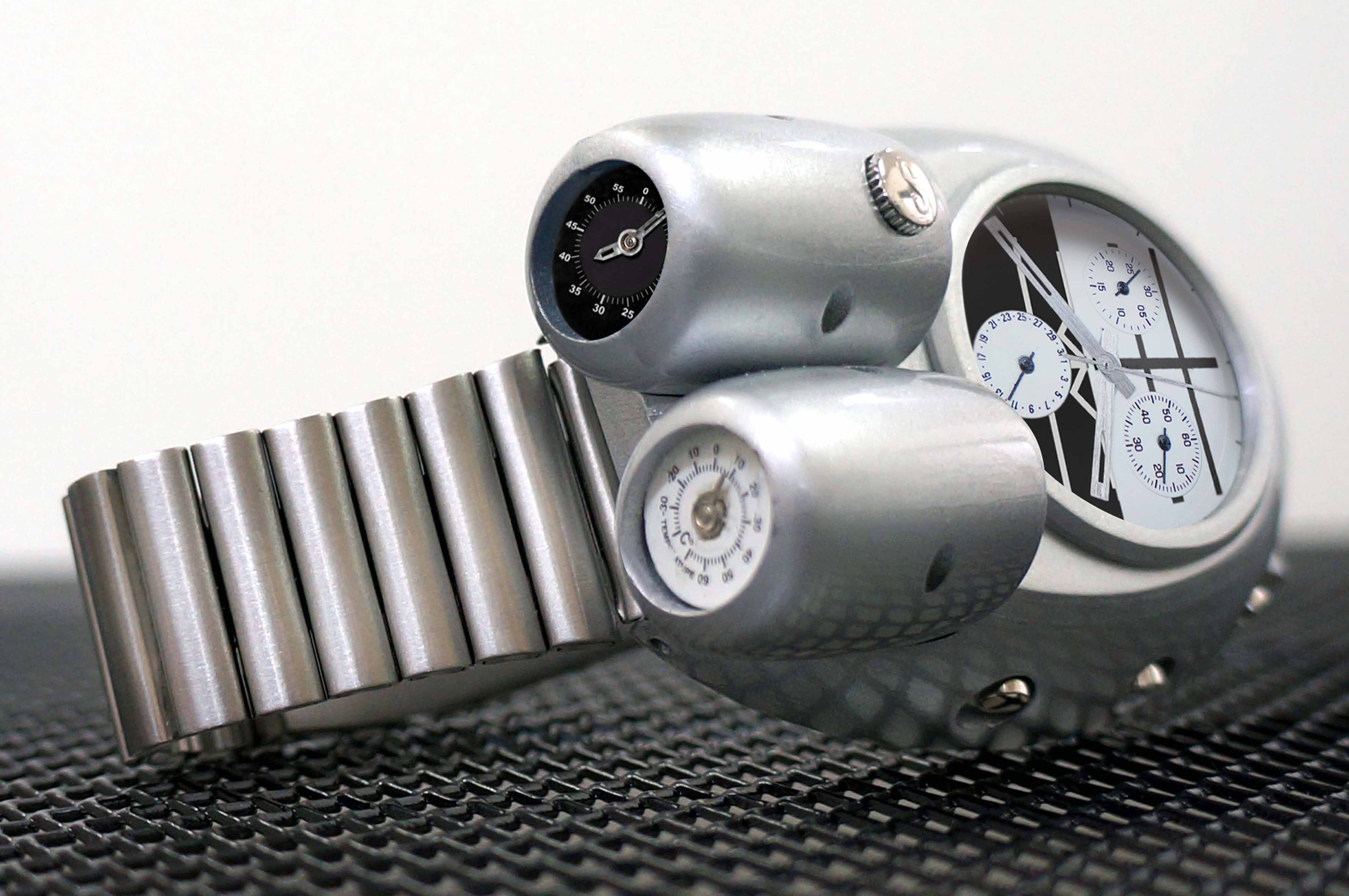 印象的な形状だけでなく、機能性も取り入れたく、クロノグラフをメインのウォッチ機能に使用。またプラス機能として、サブユニットにてセカンドタイムと温度計を付加しました。