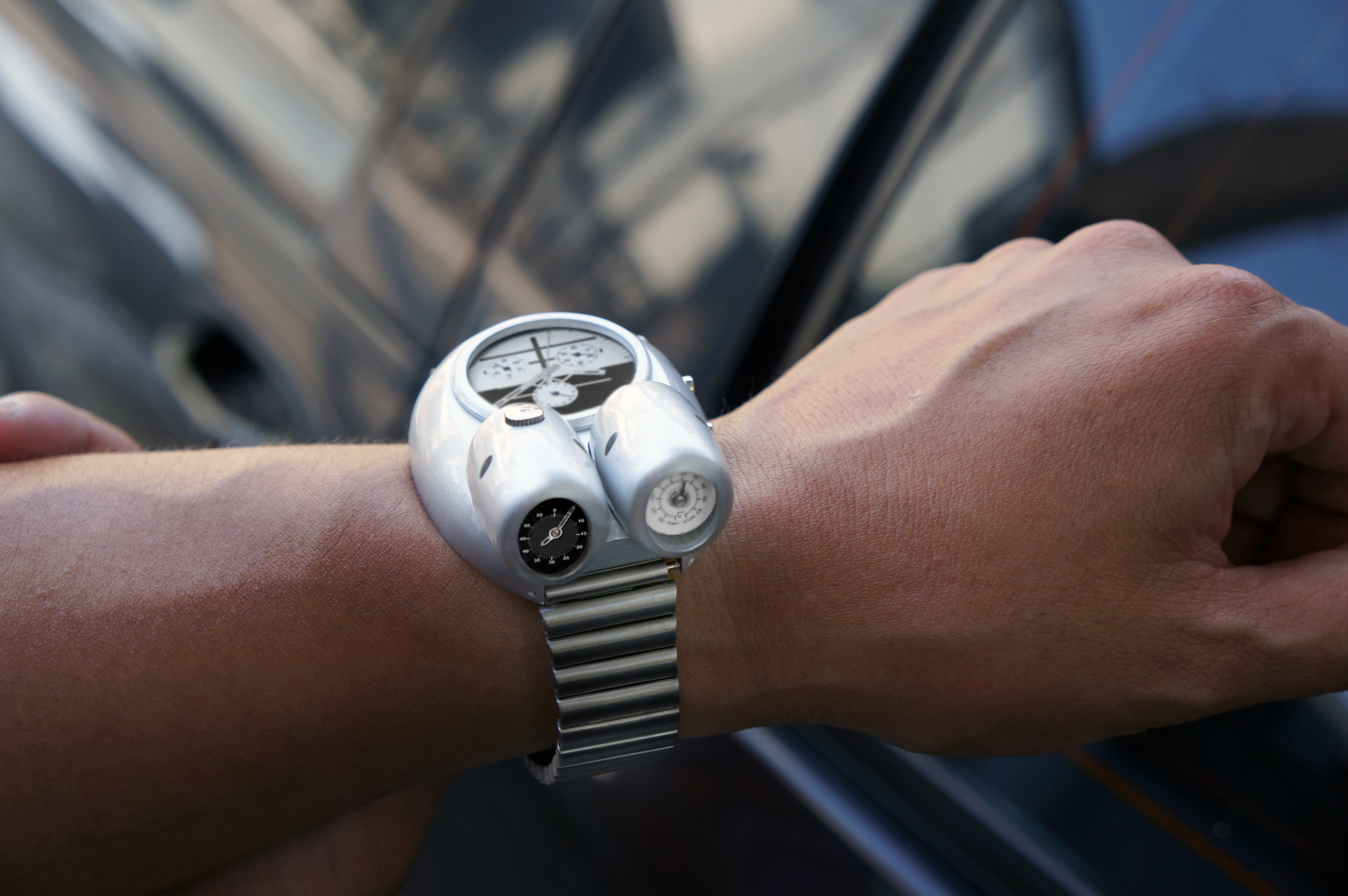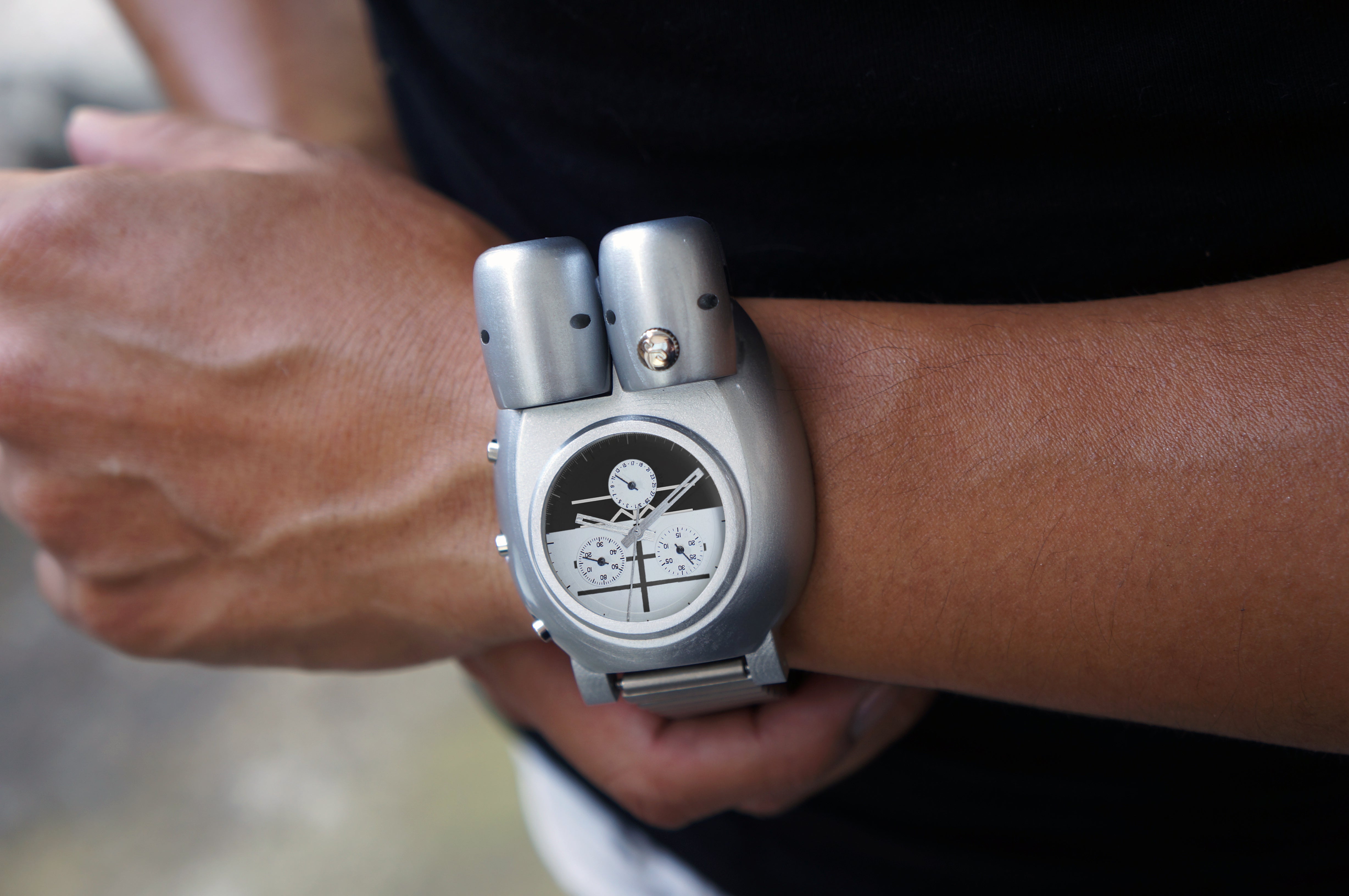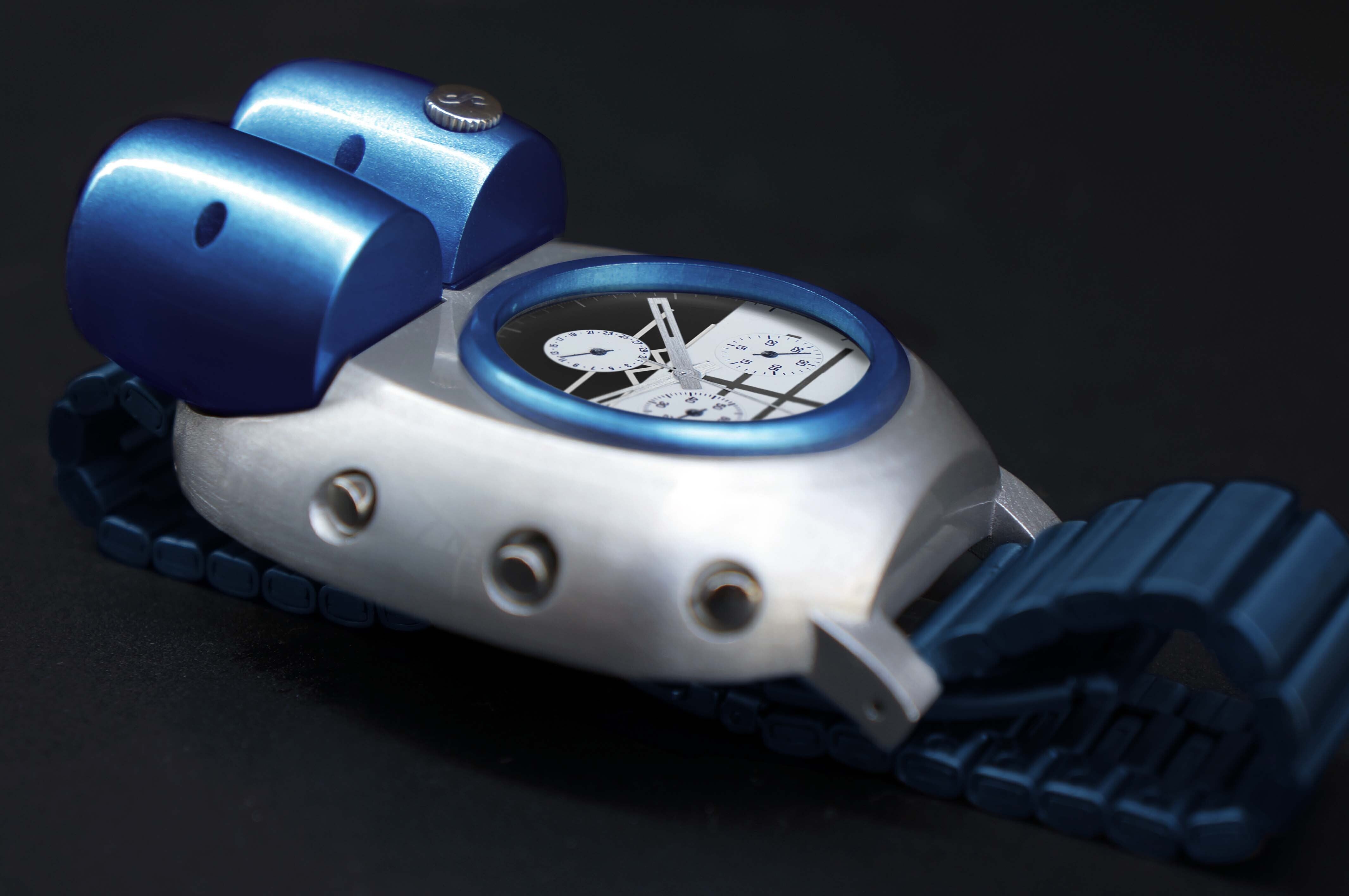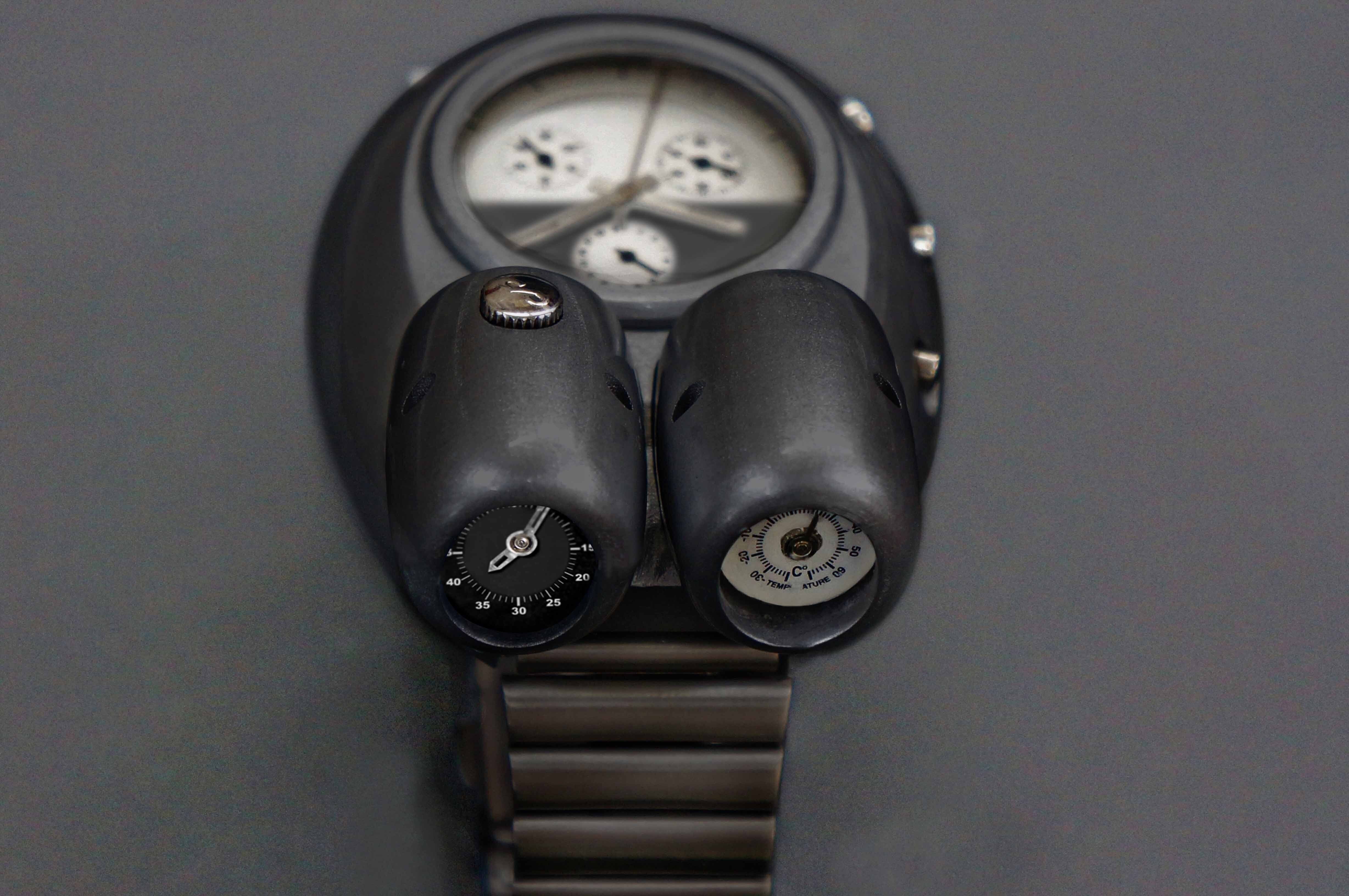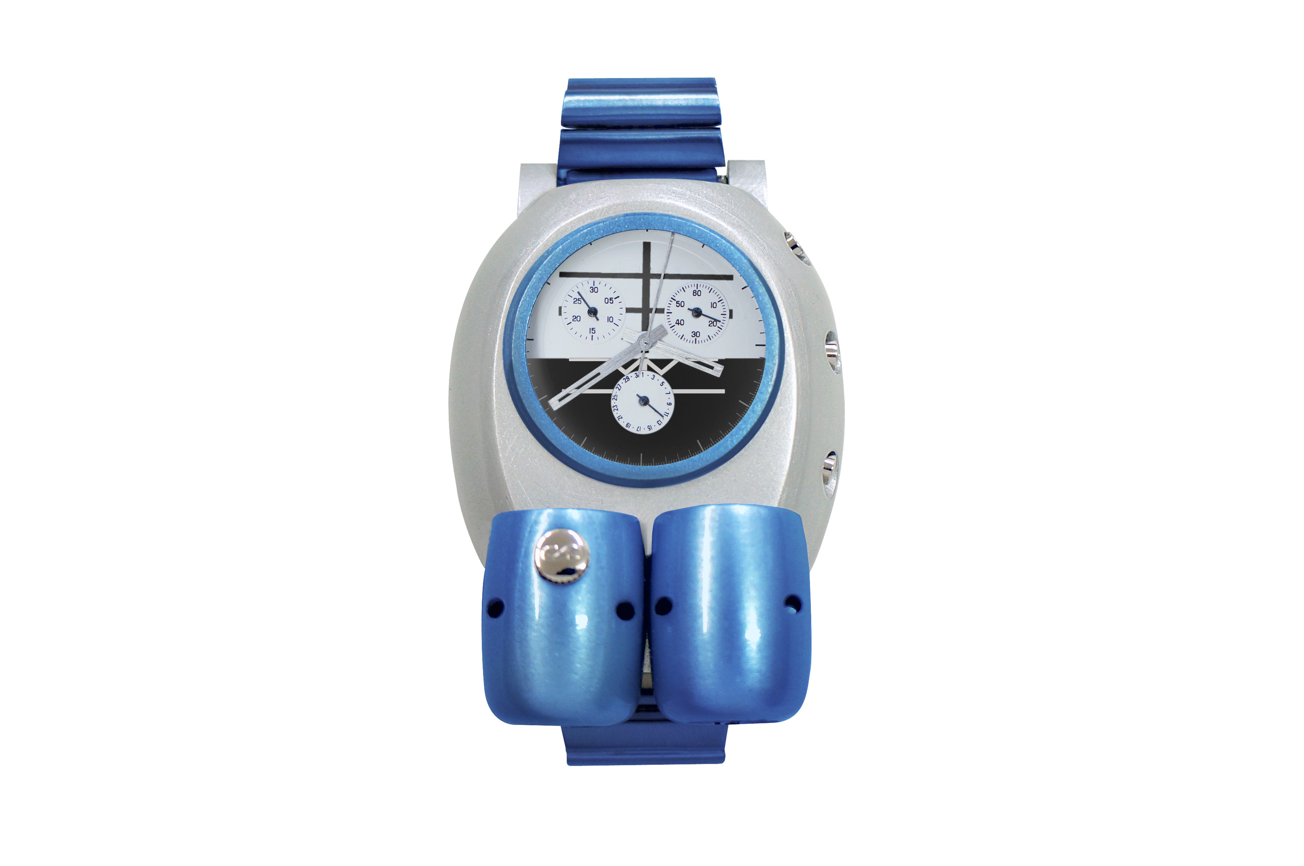 印象的な形状だけでなく、機能性も取り入れたく、クロノグラフをメインのウォッチ機能に使用。またプラス機能として、サブユニットにてセカンドタイムと温度計を付加しました。