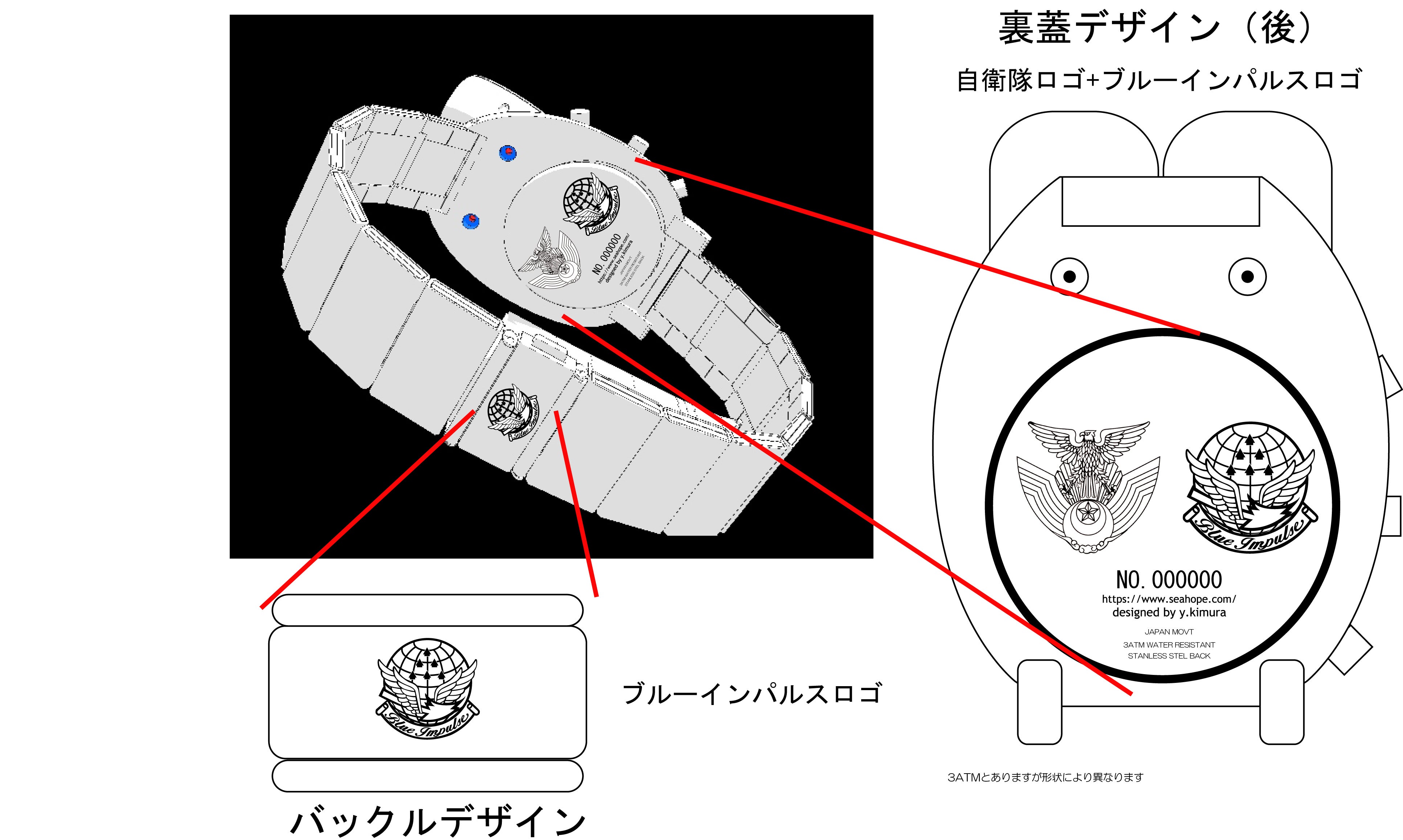 他社のブルーインパルスをテーマにした時計とは異なり、ロゴや自衛隊ブランドをあしらっただけのものではなく、ブルーインパルスT-4の特徴的なエンジン形状をデザインに取り込んだインプレッシブな腕時計を作りたいと思いこのプロジェクトを立ち上げました。