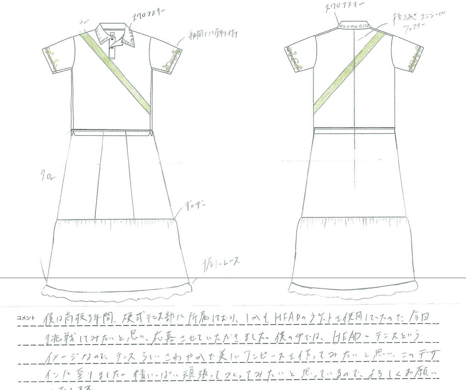 「僕は高校3年間、硬式テニス部に所属していて、しかもHEADのウエアを着用していたので、何か縁を感じて、このコンテストに挑戦しました。僕の中ではHEAD=テニスというイメージなので、爽やかで美しいワンピースを作ってみたいと思い、このデザインに落とし込みました」
