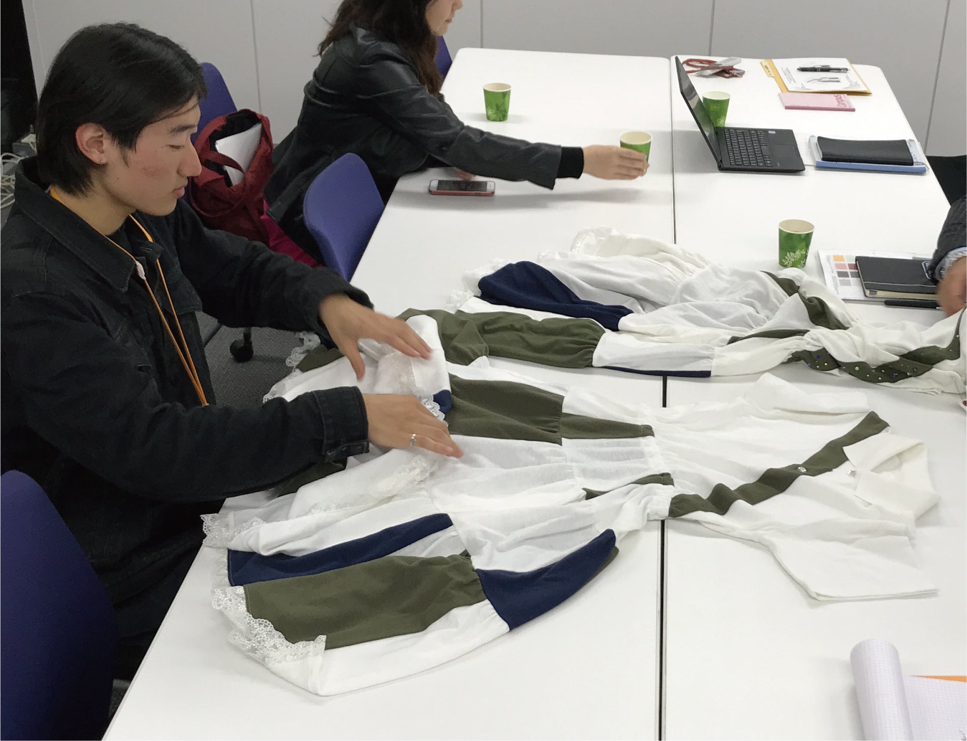 最優秀賞を獲得した文化服装学院服装科2年の若井恭祐さんの作品は大胆にポロシャツからワンピースへと大きくデザインを変更しました。審査員のDR.ROMANELLIは、ポロシャツというスポーツアイテムを美しいドレスへと昇華させたことに大きな讃美を贈っています。パッチワーク使いやカスタム的な要素も数多く取り入れた同アイテムは、全体的にもバランスが取れていて、ストーリー性も感じられるとまさに手放しの褒めようでした。