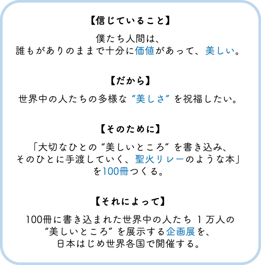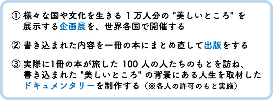 100人分の "美しいところ" を書き込める本を100冊つくり、1万人の人たちがもつ美しさを祝福することを目指します。