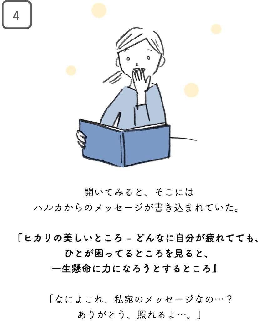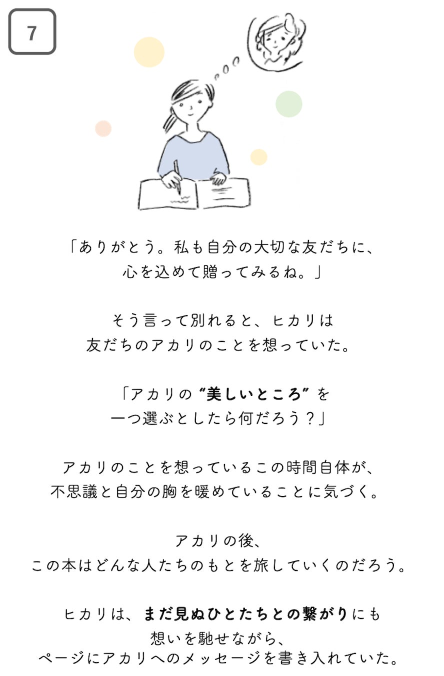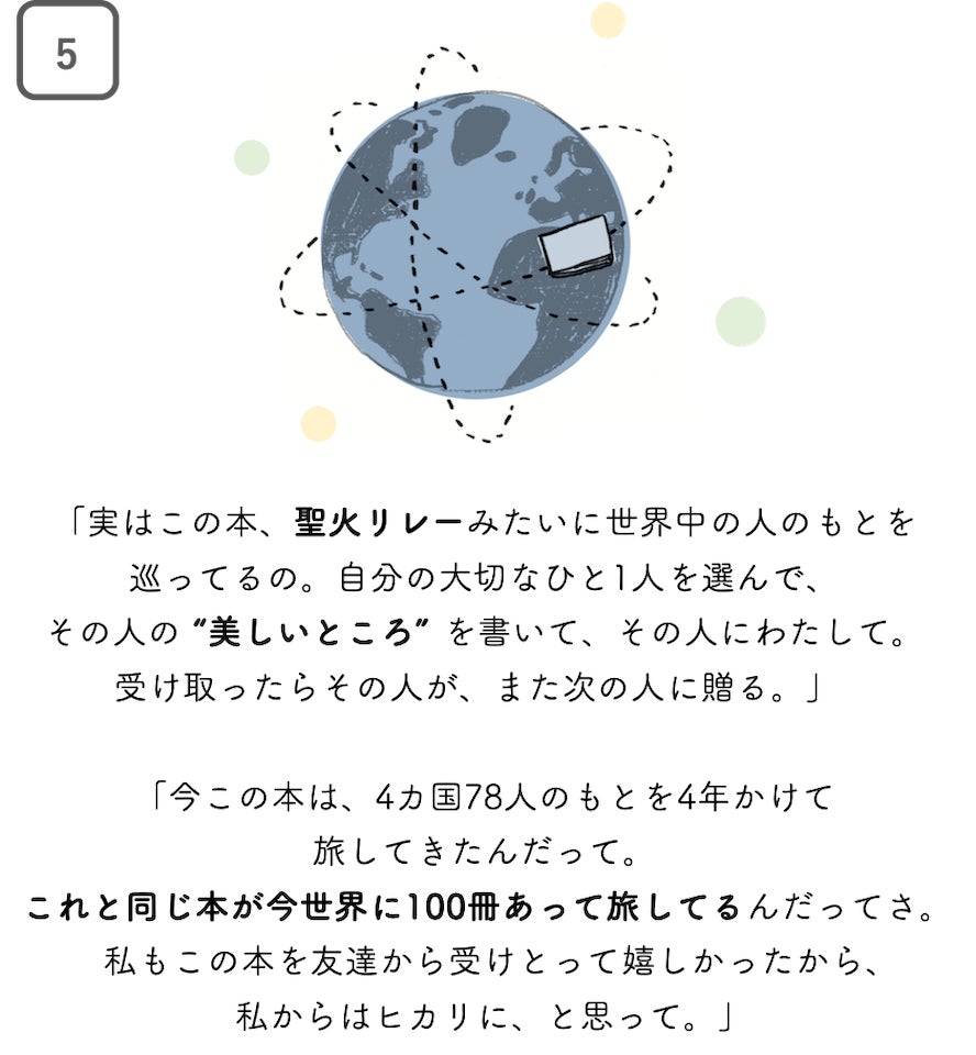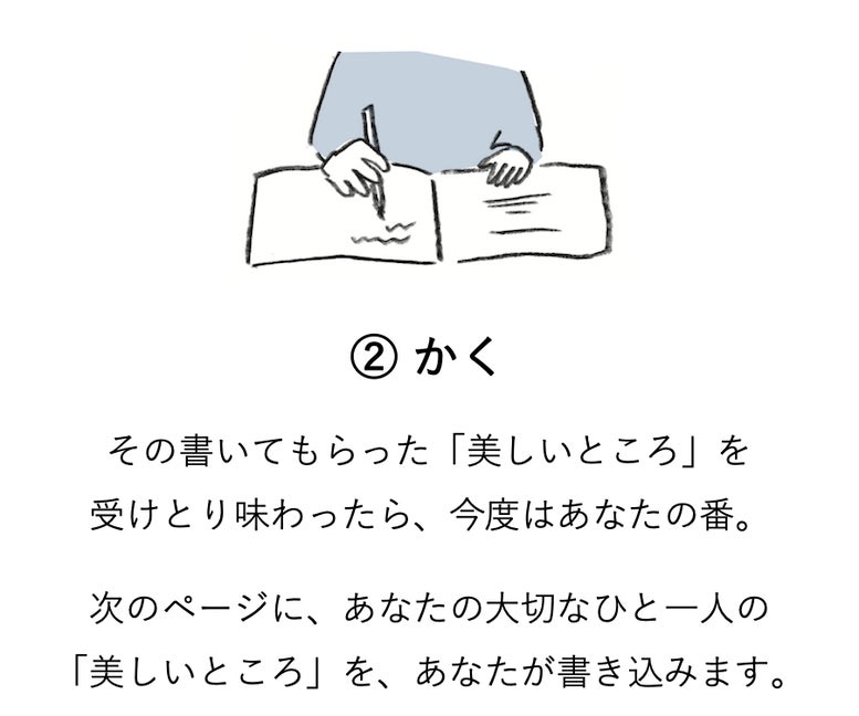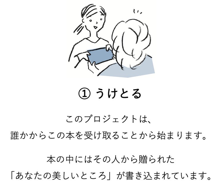 そのために、「大切なひとの "美しいところ" を書き込み、そのひとに手渡していく、聖火リレーのような本」を製作します。