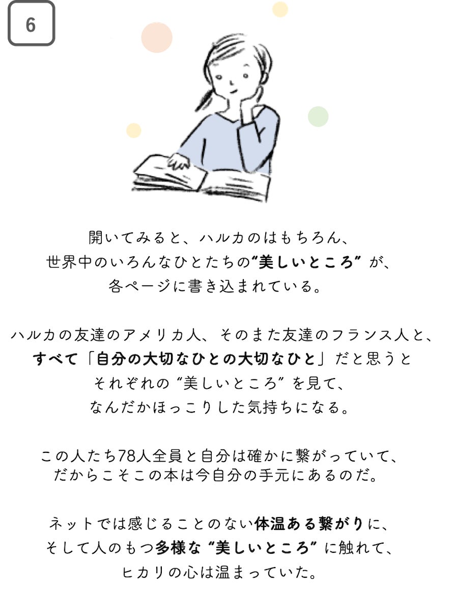 ⑥ プロジェクト・ブック「#あなたの美しいところ」の日本語版 or 英語版を 1 冊受け取ることができます。ぜひあなたが大切に想う 1 人に贈って、この本を "美しさをめぐる壮大な旅" に送り出してあげてください。(郵送予定2020年3月初頭)