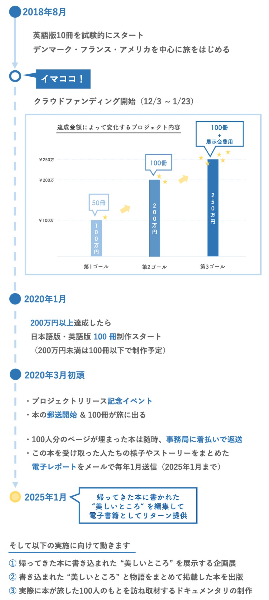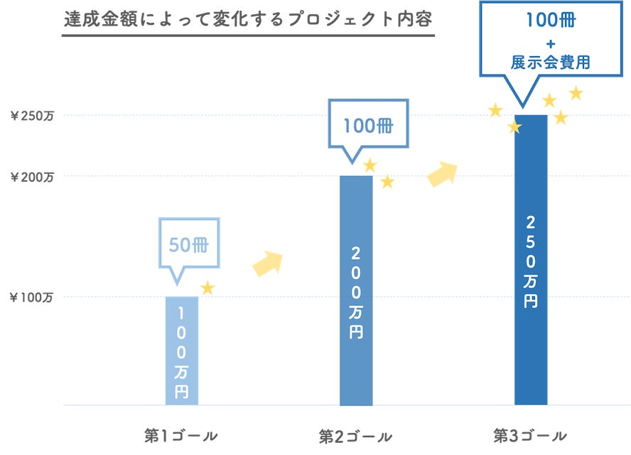 そのため100冊の発行のためには、第1ゴール100万円の次、第2ゴールの200万円を達成する必要があり、今回のプロジェクトでは、最低でもその 200 万円の実現を目指します。