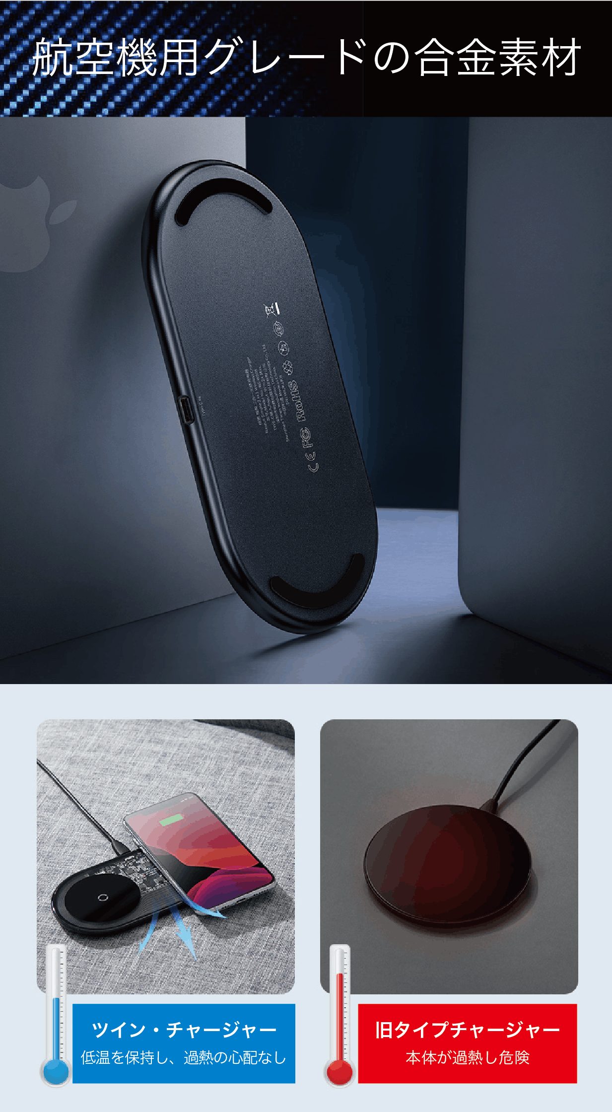 厚さ7㎜、130gの軽量コンパクトさで、2台のデバイスを同時にワイヤレス充電。デバイスを置くだけで瞬時に充電がスタート!インテリジェントライト&スリープ機能搭載。シースルーのスタイリッシュなデザインで、航空機用グレードのアルミニウム合金が低温を保持します。