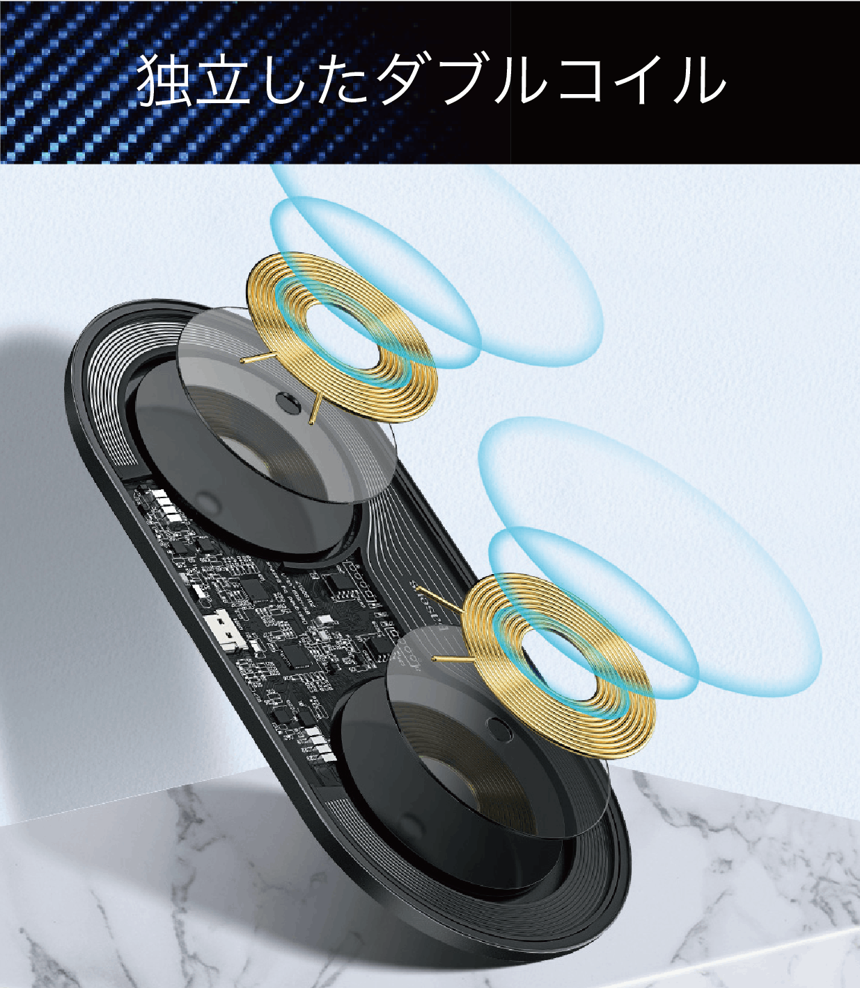独立した内蔵ダブルコイルが、互いに干渉することなく安全に高速充電を行います。