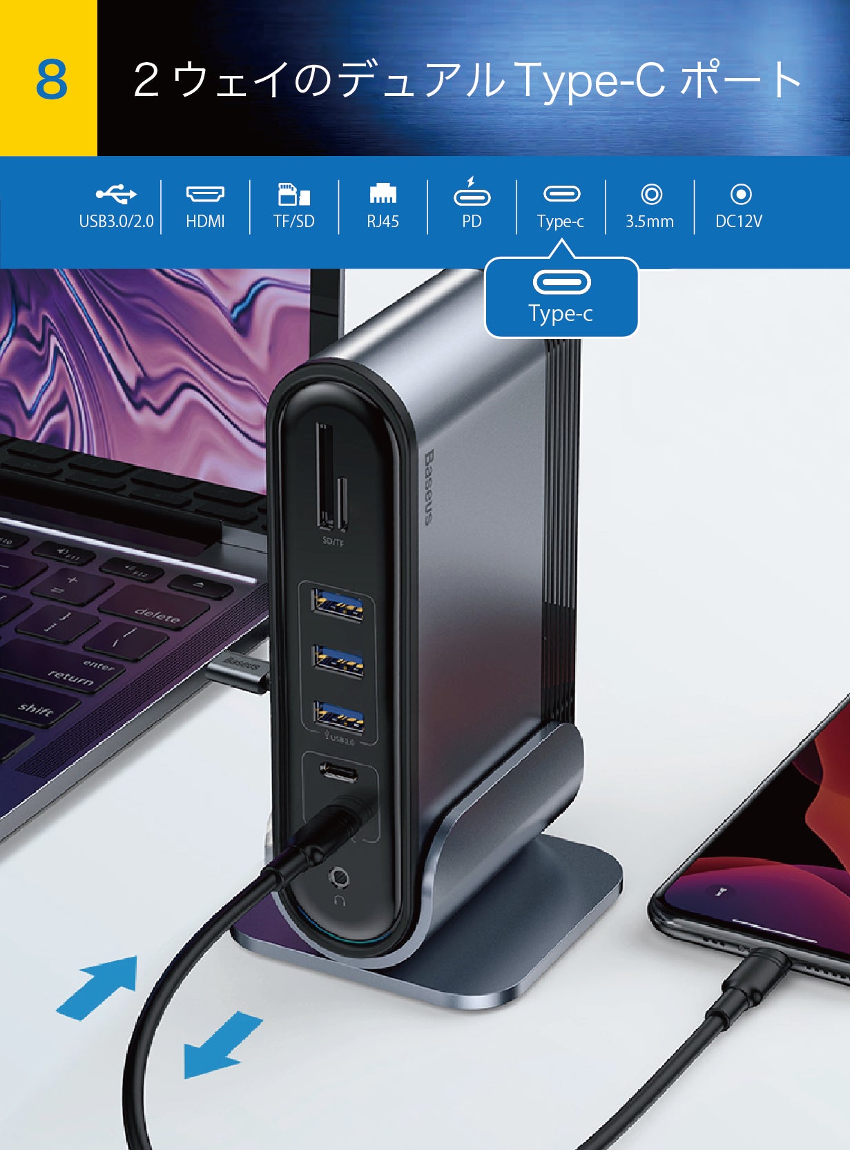 スマートなノートPCとも合う、ホストコンピューターのような垂直型の、スペースを取らないスタイリッシュなデザイン。17つのポートを前後の両面に分布させ、ケーブルを抜き差しやすいように設計されています。