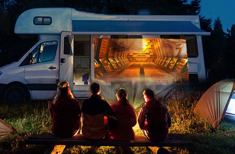 バッテリー内蔵で約2時間の使用が可能な【ポケムービー】 なら、キャンプの夜もひと味違ったものになるでしょう。家族や恋人、親しい仲間たちと満点の星空の中、たき火にあたって好きな映画を見るというような贅沢な時間も過ごせます。