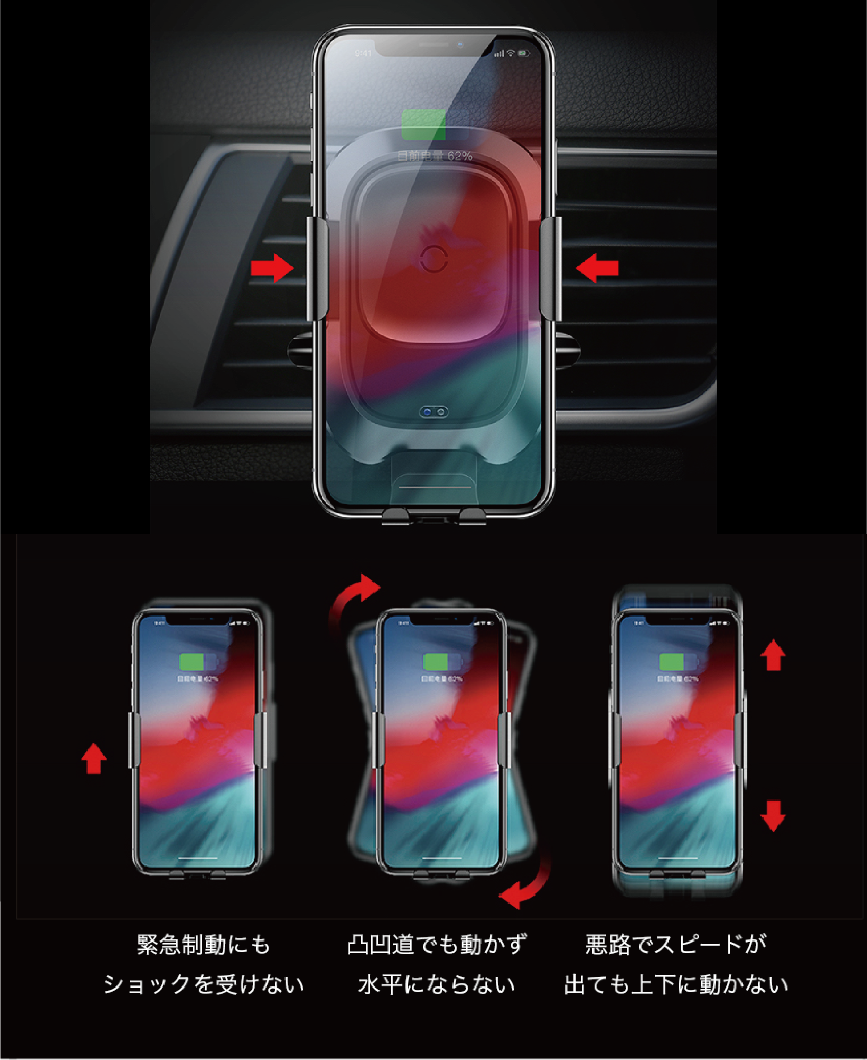 スマホをカーホルダーに置くだけで、センサーにより自動的にアームが閉まりロック。0.1秒でチャージ開始!