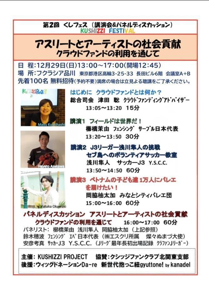 2019/11/12 23:13皆さまこんばんは!というわけで、満を持してリリースさせていただきます。題して、第2回くしフェス”アスリートとアーティストの社会貢献 クラウドファンドの利用を通じて”!!12月29日 日曜日13時〜17時 フクラシア品川参加無料 先着100名講演会、パネルディスカッションになります。コラボさせていただきますは、こちらの豪華メンバーの方々。レンタルJリーガー サッカー選手 浅川隼人さん踊る社長 バレエ 岡脇柚太加さんクラファンJリーガー 安彦考真さんフェンシングエペ日本代表 鈴木穂波さんクラウドファンディングアドバイザー 津田 聡さんにご参加いただきまして、開催させていただきます。協賛はクシッジファンクラブ北関東支部にいただいております。後援は ウイッグドネーションDa-re 、新世代抱っこ紐gyuttone! by kanadel 様にいただいております。さて、ワクワクしますコラボイベント。本当にこのような形で開催させて頂くことになり、なんともありがたい!!しかもゲストはそれぞれ第一線で活躍されている方々、ワクワクワクワクワクワク!私のクシプロにてイベントページを作成させていただきました。ご参加いただける!!と言っていただける皆様ぜひ参加ボタンをポチッと!ページはこちら!イベントページ参加費は無料です。素晴らしい出会いになりますように。ひとまずお知らせでした。 もっと見る