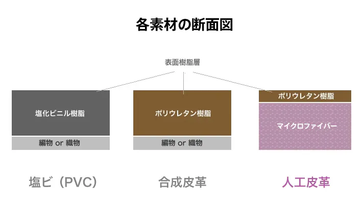 塩ビ(PVC)、合成皮革、人工皮革の断面は、図のように比較できます。
