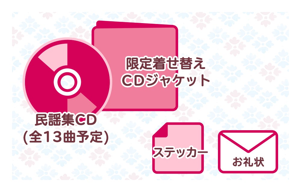 ・5,000円の方:故郷民謡集CD、クラウドファンディング限定着せ替えCDジャケット、特製ステッカー、お礼状は普通郵便にて送付します。