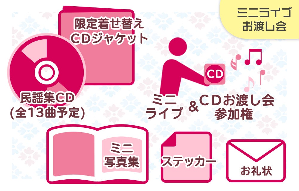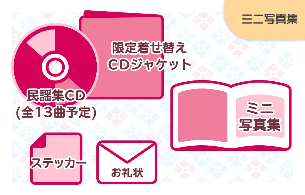 ・8,000円の方:故郷民謡集CD、クラウドファンディング限定着せ替えCDジャケット、特製ステッカー、お礼状、ミニ写真集は普通郵便にて送付します。