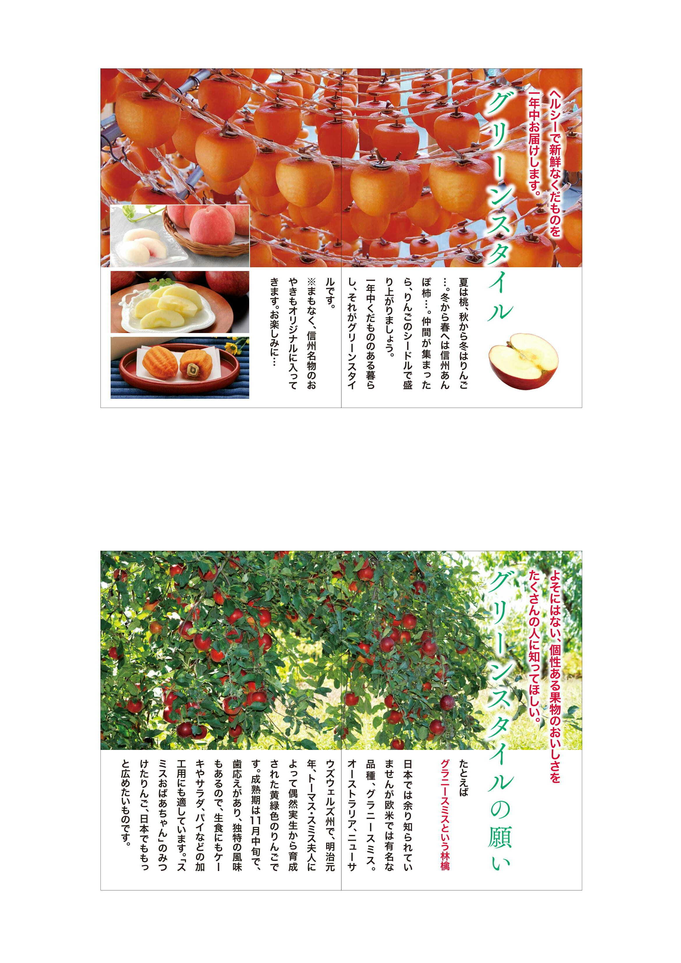 とうもろこし10本、桃あかつき2キロ、桃川中島白桃2キロ、りんご(紅玉3キロ、アルプス乙女2キロ、シナノスイート3キロ、グラニースミス3キロ、ふじ3キロ)、干し柿(あんぽ柿)1キロ、シャインマスカット1キロ、シードル翠1本
