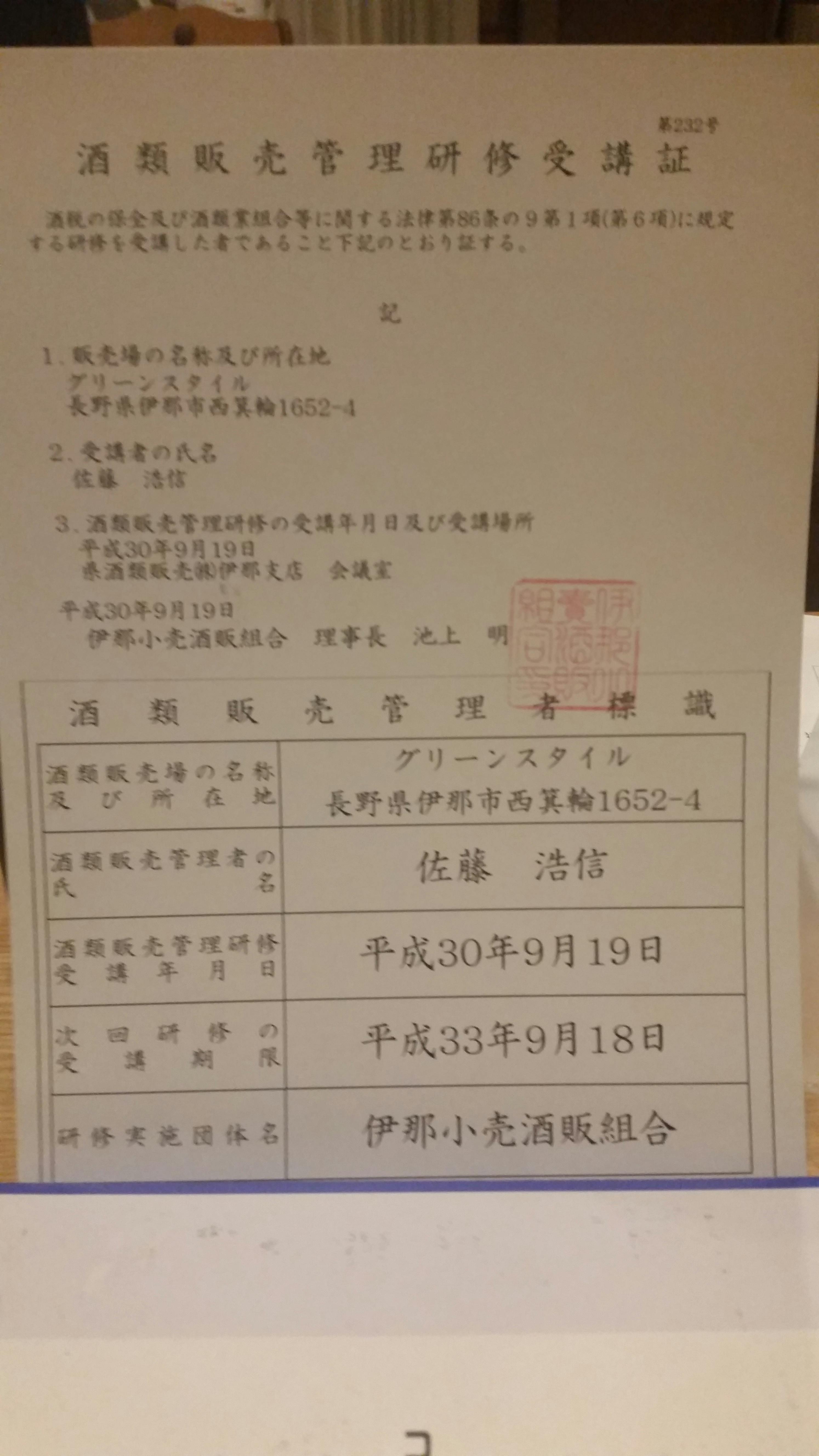 酒販免許及び酒類販売研修受講証