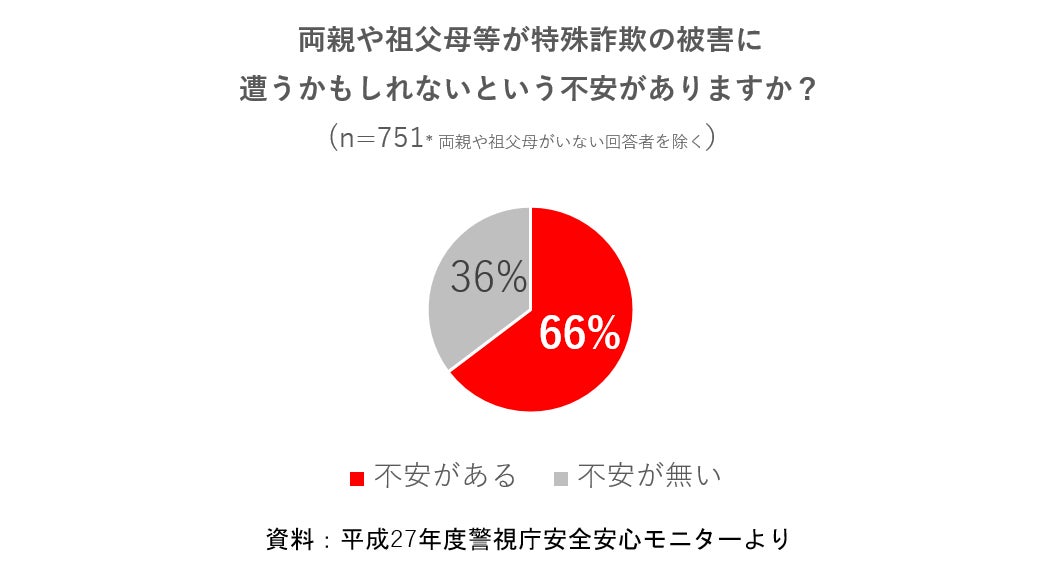 両親や祖父母を持つ人の2/3は、親や祖父母が振り込め詐欺などの特殊被害に遭う不安を感じています。