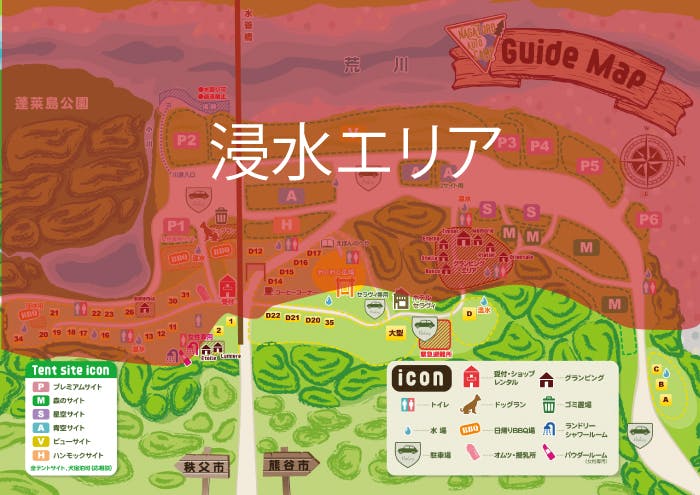 荒川から溢れ出た水はテントサイト全てとバンガローエリアの大半、管理等まで届いていました。