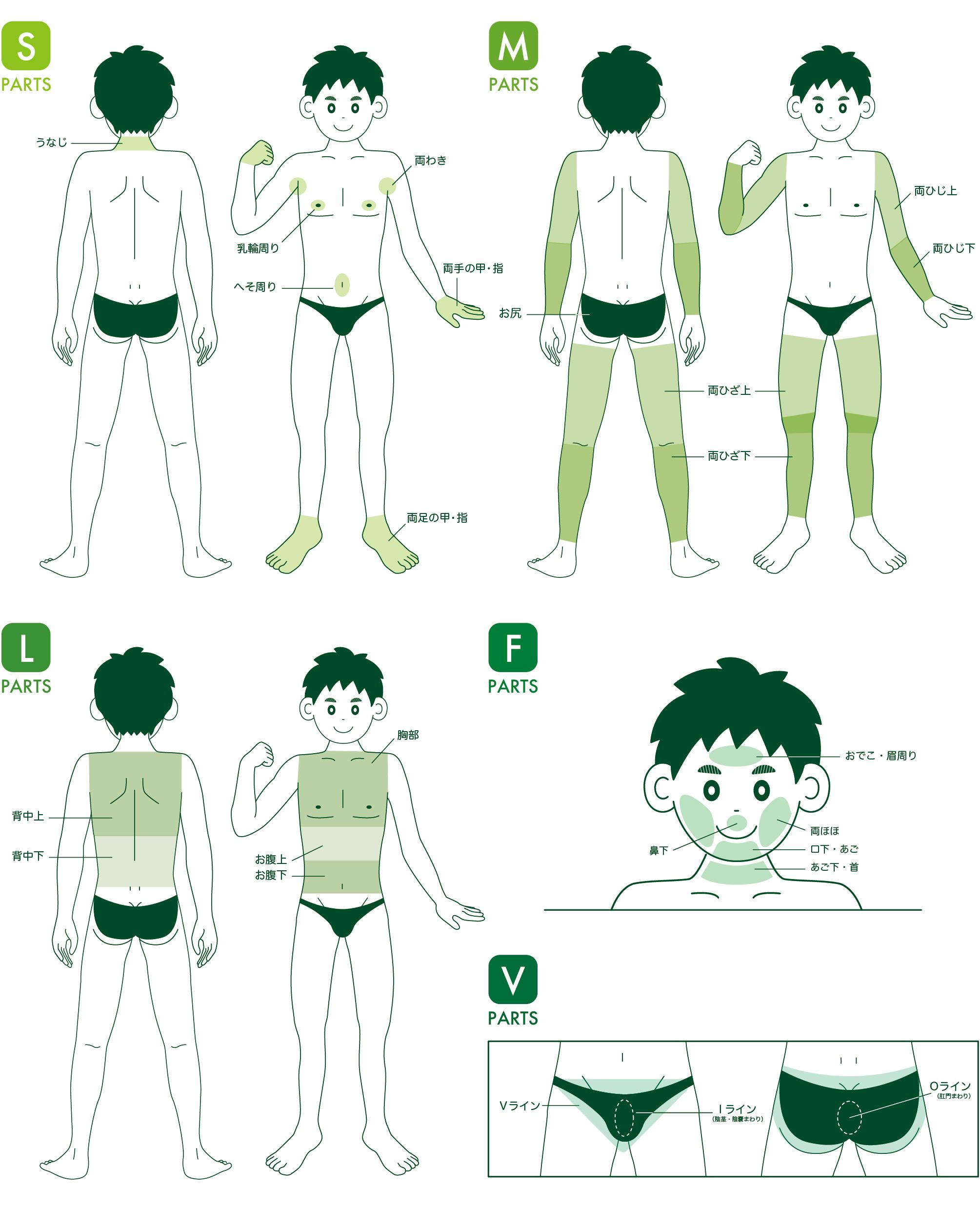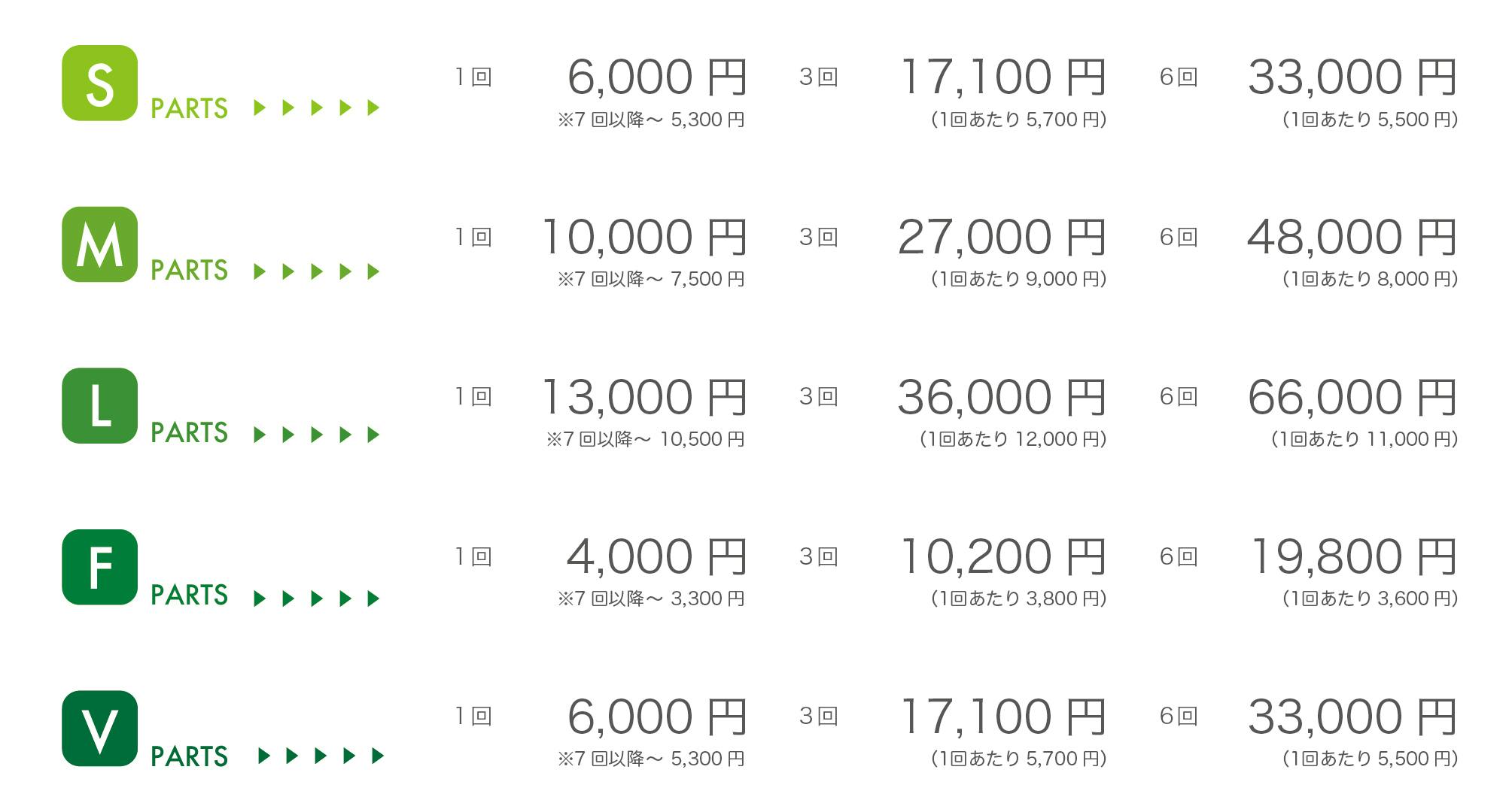 全身を施術面積に応じてパーツごとに分け料金を設定し、各パーツ1ヶ所1回の価格です。3回コース、6回コースは1回あたりの価格が割引されます。またお得なセット料金もご用意しております。