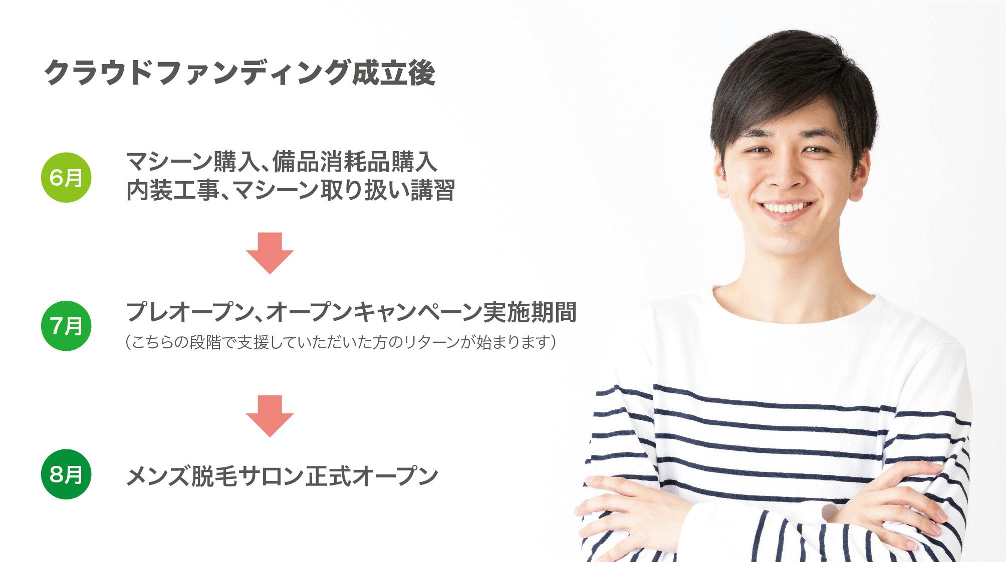 誰でも気軽に安心して通えるメンズ脱毛サロンを目指してこのプロジェクトを立ち上げました。脱毛への第一歩を踏み出すお手伝いをし、安心して通うことのできる"低価格で隠れ家的メンズ脱毛サロン"を都内に開業したいと考えております。