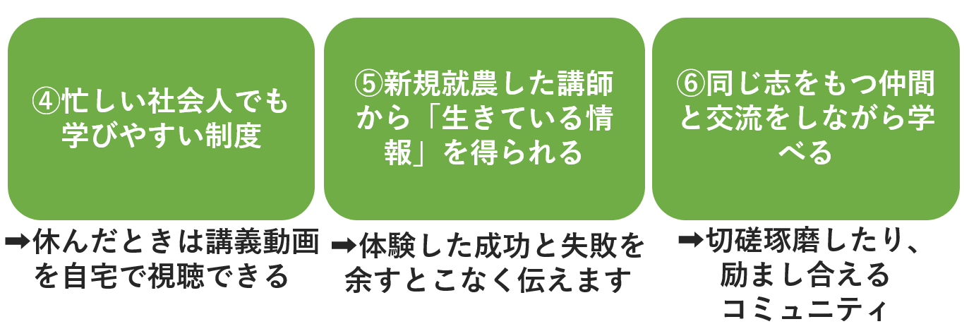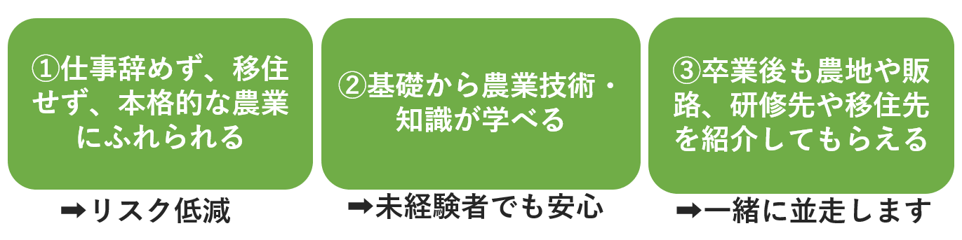 基礎的な農業技術を身につけたり、実際に体験して自分が本当に農業をできるのかを考えてみることや、就農に関するノウハウを知ることができたり、つまづいたときに頼れる存在ができれば、リスクは低くなり、農業に挑戦してみよう!農業を続けてみよう!という人材も増えてくるでしょう。