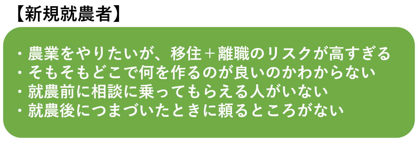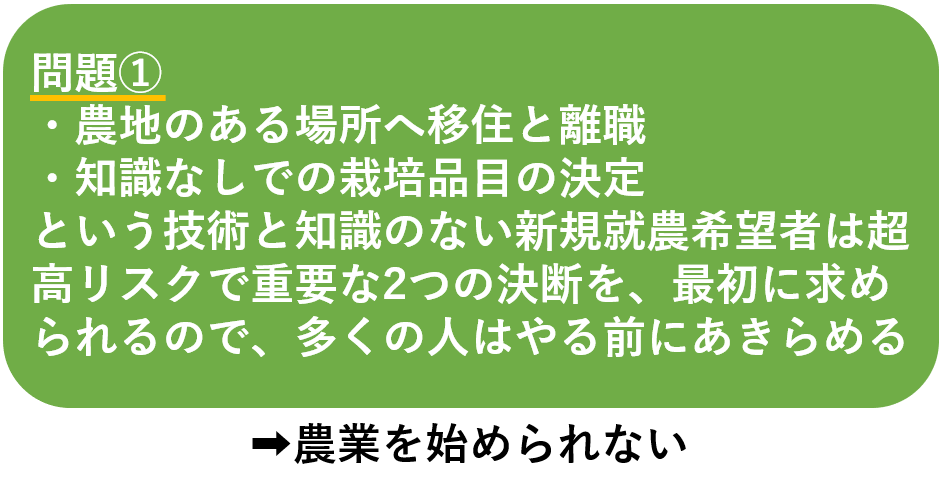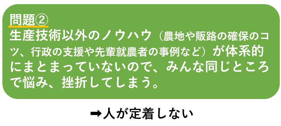 このように、 “農業をやりたいが始められない・続けられない”=“農業をやりたい人が来ない・定着しない” には構造的な問題があります。