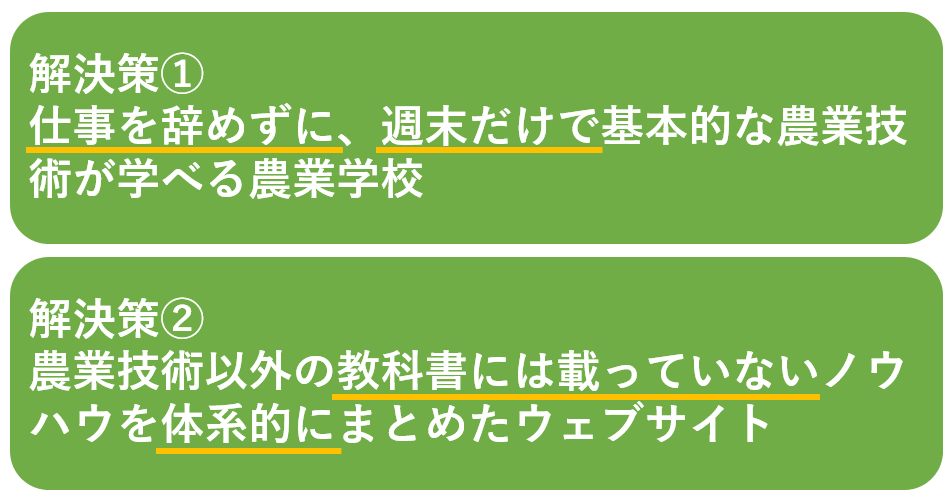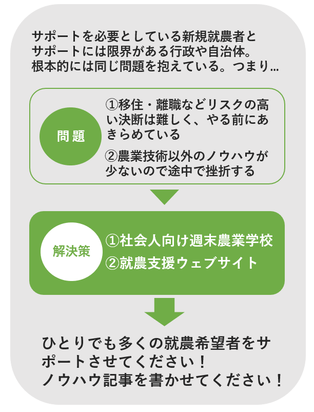 私たちは、「新規就農者のやりたいけどリスクが高すぎる、どこに相談したらよいかわからないからあきらめる」と「行政や自治体、生産者の人が来ない・定着しない」を解決するために、新規就農希望者に「社会人向け週末農業学校」と「就農支援ウェブサイト」を提供したいと考えています。