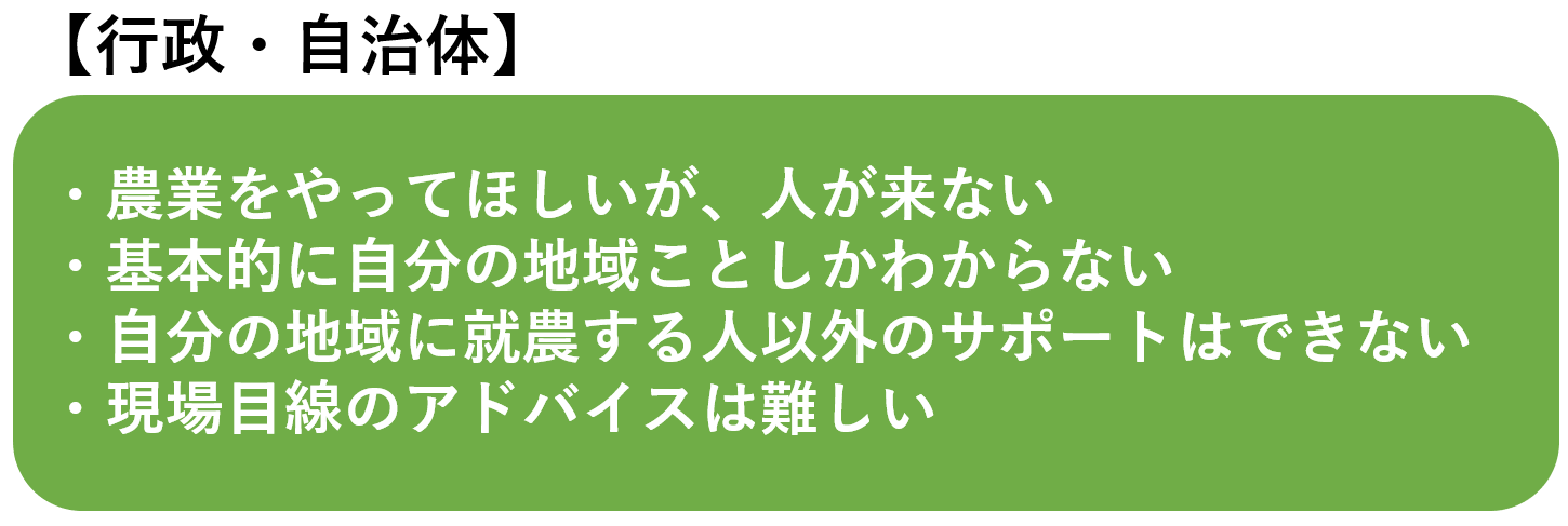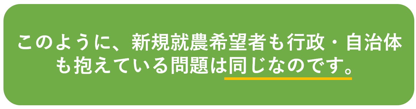 農業をやりたい人(新規就農希望者)も、農業をやってほしい人(行政・自治体)もたくさんいるのに、なかなか「人が来ない・定着しない」ため、行政や自治体の努力むなしく上記の問題を解消できていません。
