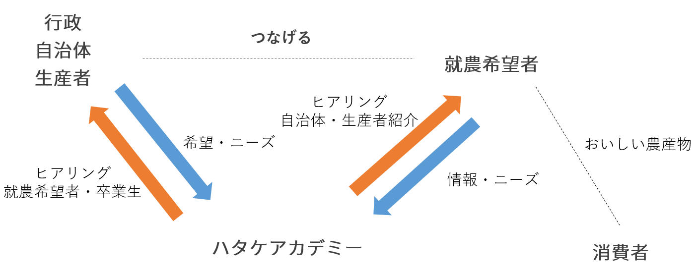 深見、渡辺も新規就農を経験してきて、「どこに相談したらよいのかわからない」という疑問を常々感じていました。同時に行政の方とのかかわりの中で、一生懸命に農業者のことを考えて動いてくれているが、各担当者ができることには限界があることもわかりました。「農業をやりたい人」と「農業をやってもらいたい人」の双方に一番近い存在である私たちが間に入ることで解決できる問題だと思います。
