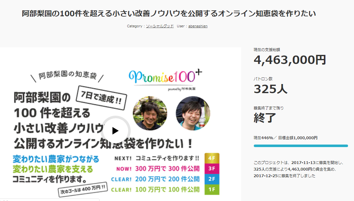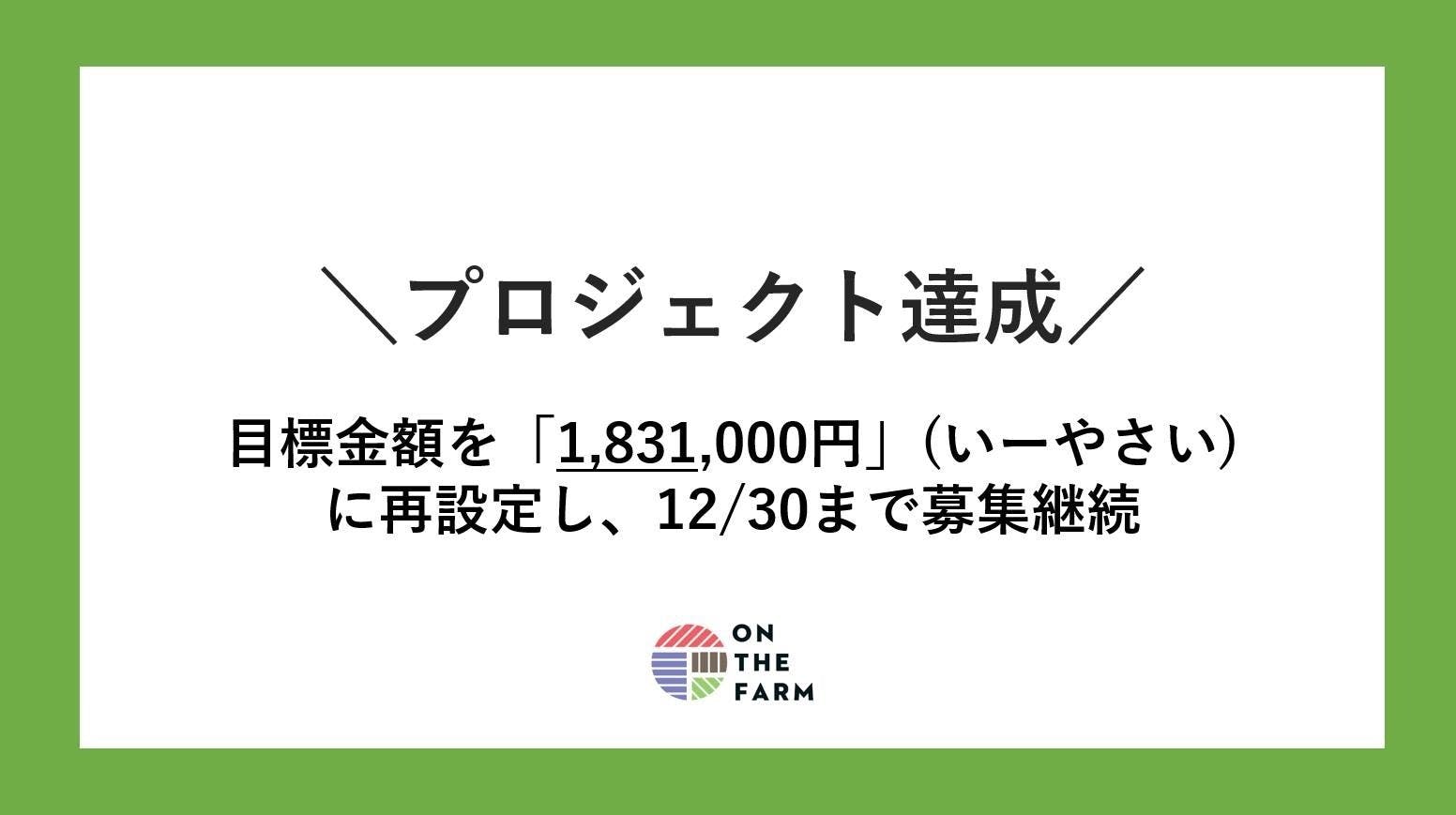 2019/12/28 18:5911/28よりスタートしたCFプロジェクトですが、目標金額の150万円をさきほど達成しました!113名の方から支援を受けております!ひとえにみなさまの応援のおかげで達成することができました!本当にありがとうごいます!!12/30まで残り3日間ありますので、目標金額を上乗せし、ストレッチゴールとして『183.1万円』(いーやさい)に再設定いたします!メディアの記事作成にはコストがかかりそうなので、最後まで継続募集をさせていただければと思います。追加支援分については、記事作成や各地への取材の交通費に使用させていただきます。最後までお付き合いいただければ幸いです。よろしくお願いします! もっと見る