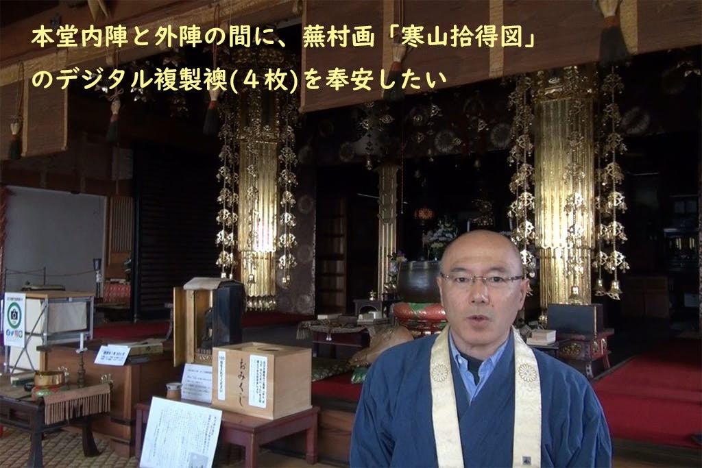 昭和10年に改築された現在の本堂では、内陣と外陣の間の正面に建具が全く入っておりません。幻の蕪村の名画「寒山拾得図」をデジタル複製技術により再現し、蕪村当時のように本堂内に奉安したく計画いたしました。