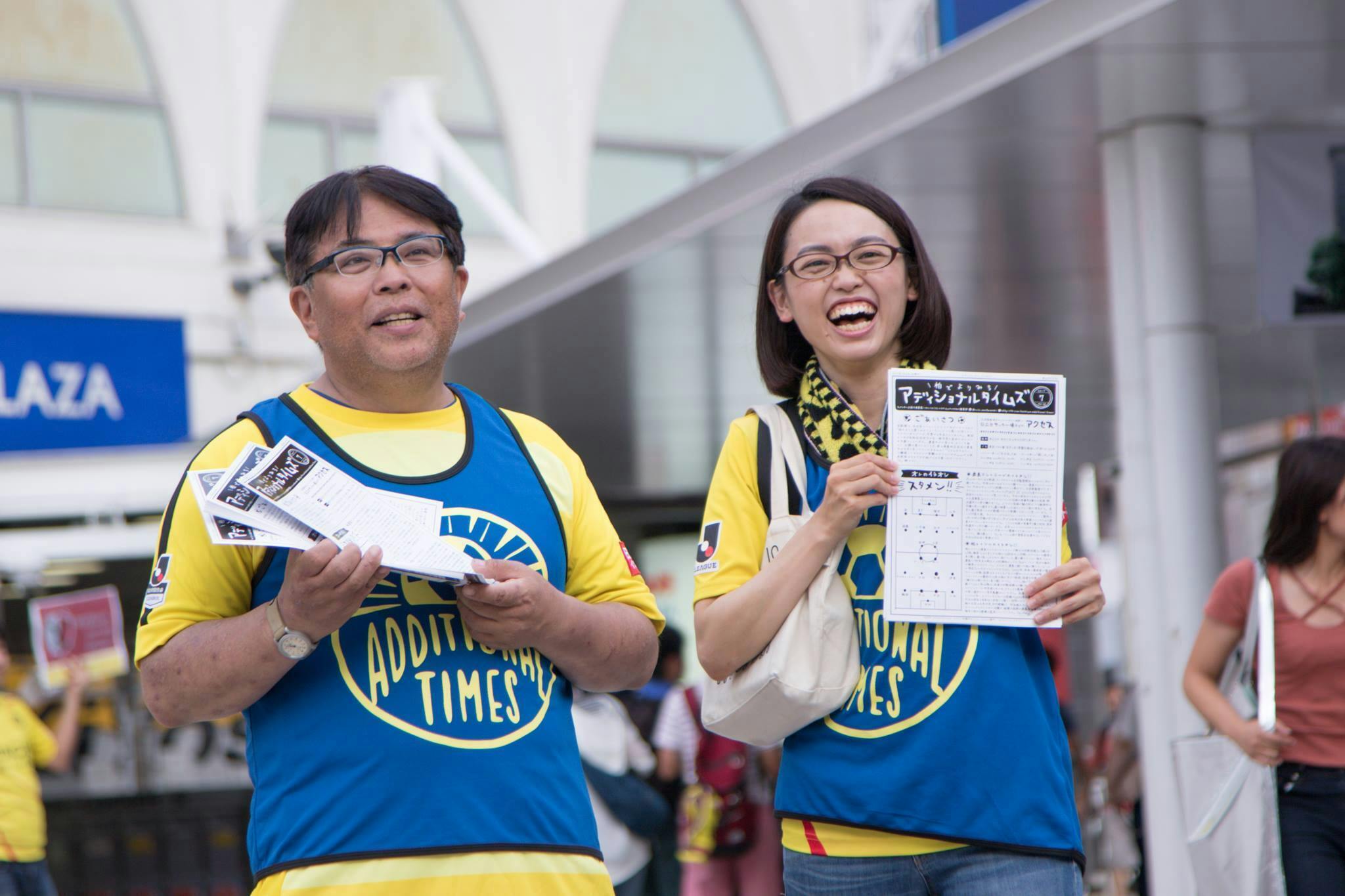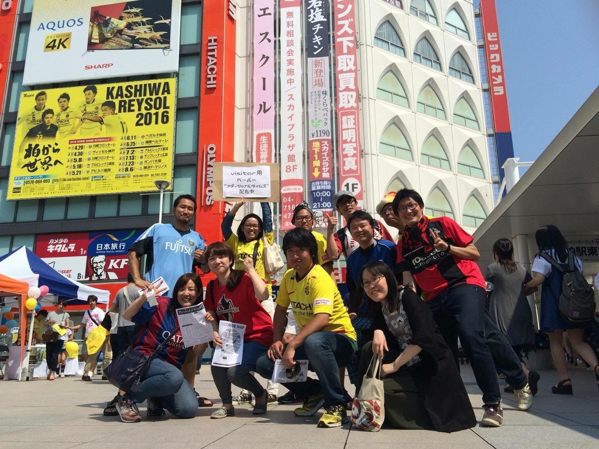 「柏よりみちAT」は柏で行われるJリーグホーム戦の観戦にやってくるビジターサポーターにスタジアムまでの行き方や柏のグルメスポットを掲載したフリーペーパーを制作し、JR柏駅東口前で配っています。